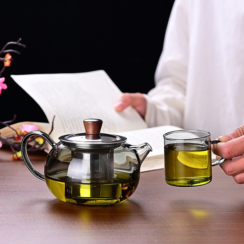 ステンレスフィルターライナーティーポット、スチール漏れティーポット、カラーハンドル、高ホウケイ酸ガラスティーポット