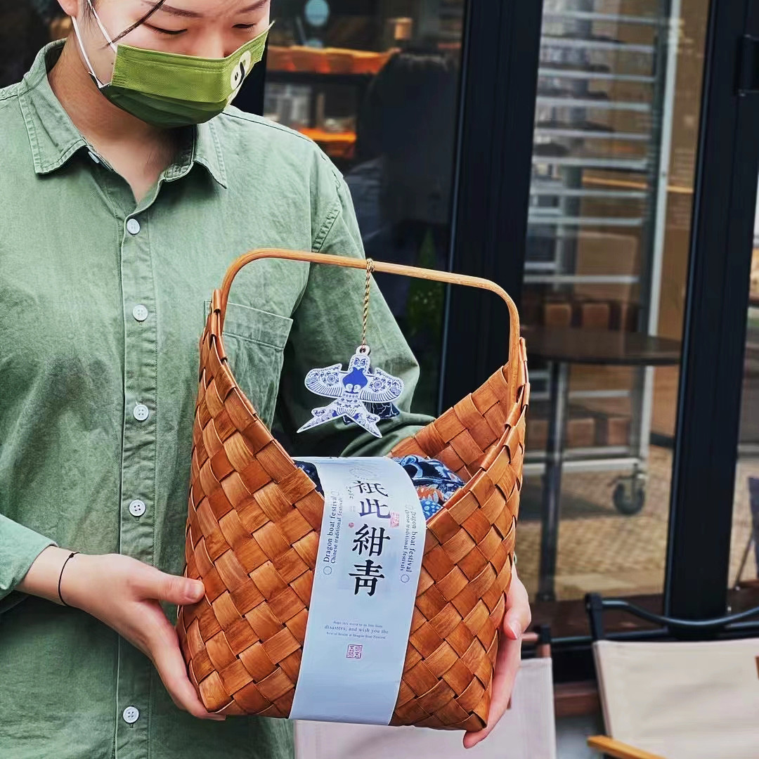 手作りの竹のバスケットの上にちまきのギフトボックスをかぶせます。