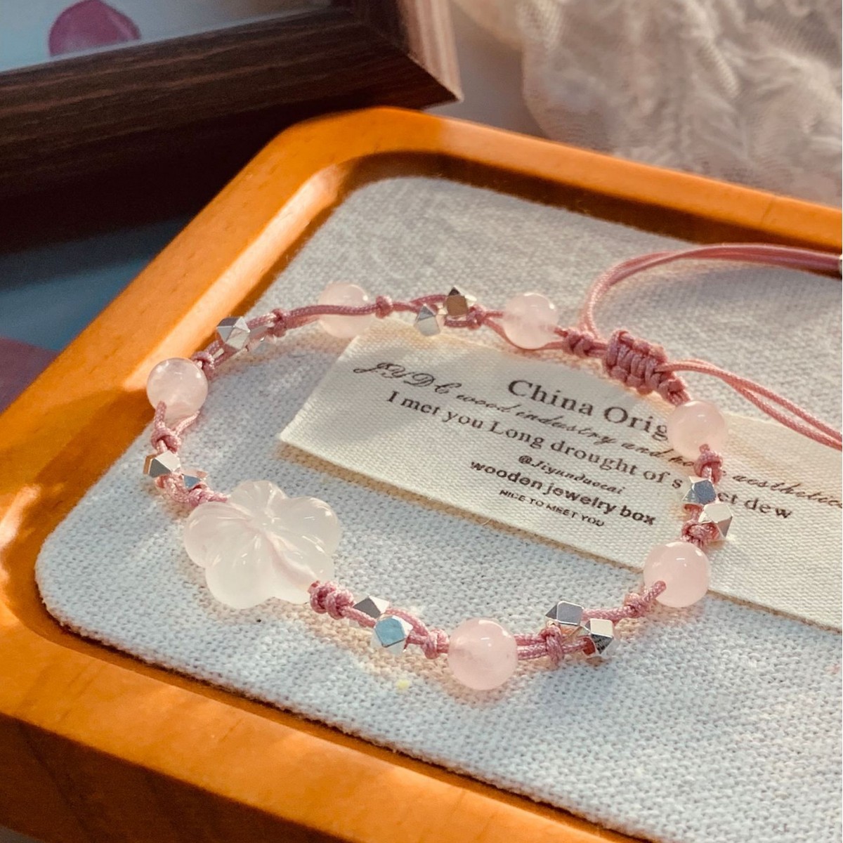 天然白玉髓桃花手串少女粉水晶手链碎银编织手绳国风小众高级感女