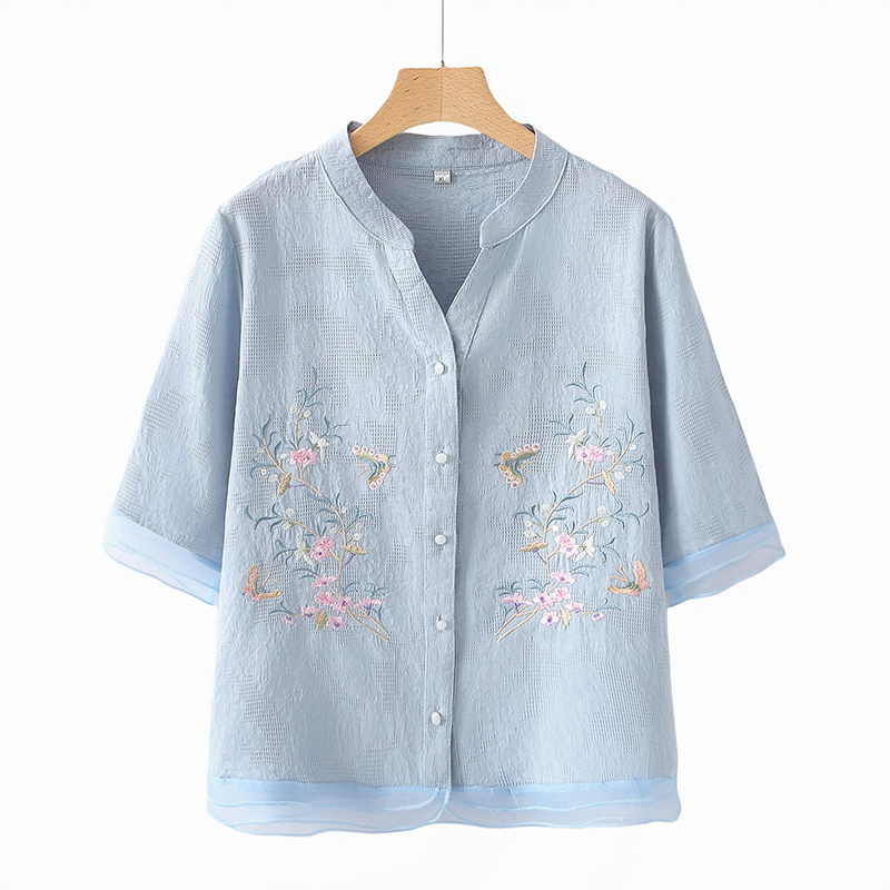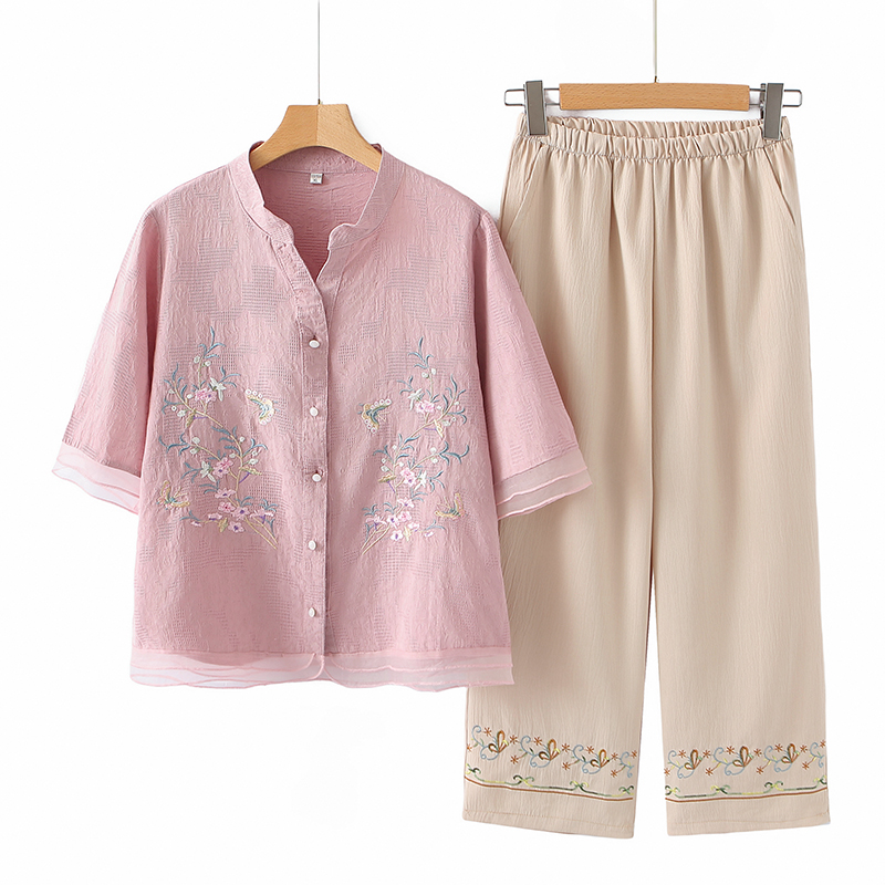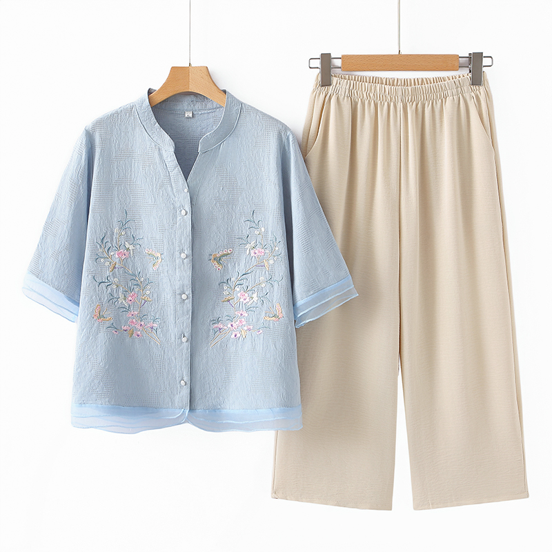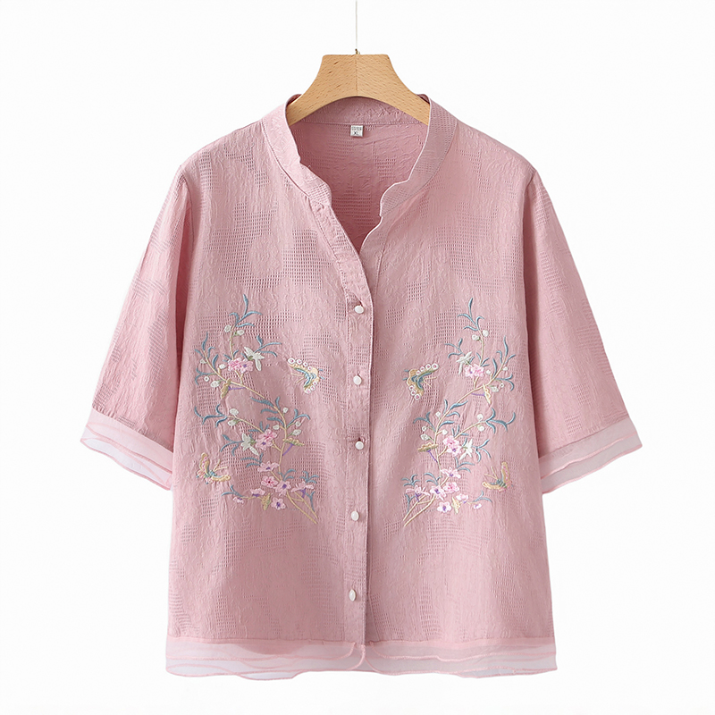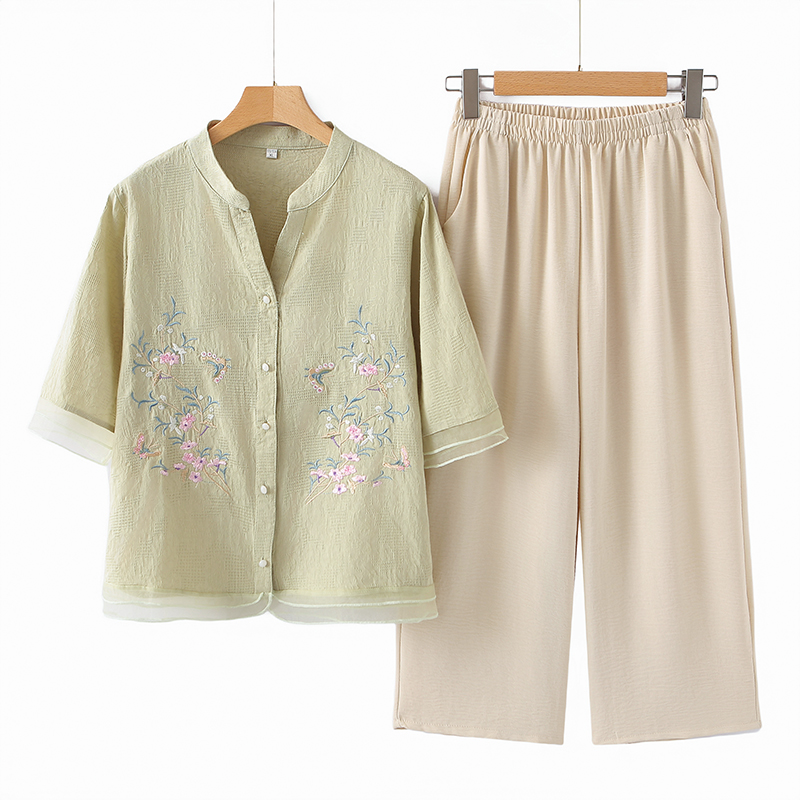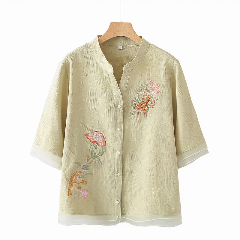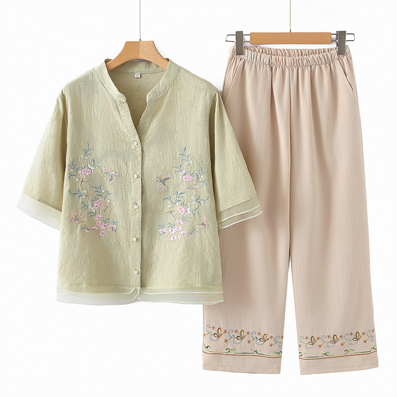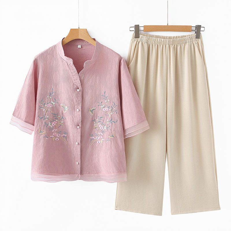 ママの夏スーツ、中高年女性のファッショナブルな綿麻刺繍シャツ、おばさん夏服