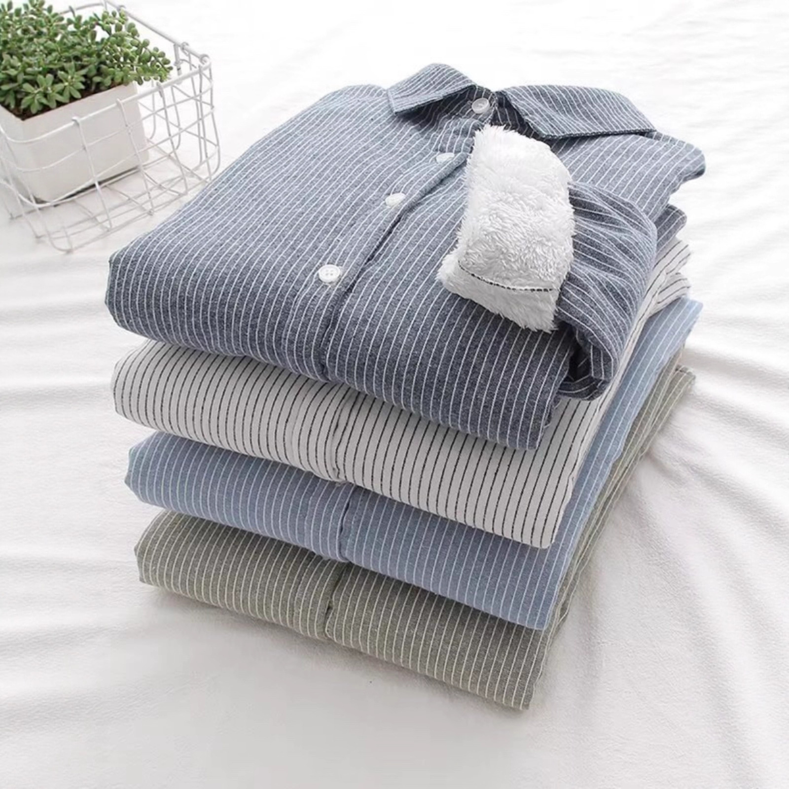 长袖条纹衬衫女秋冬加绒新款休闲遮肉显瘦打底衫百搭上衣纯棉衬衣
