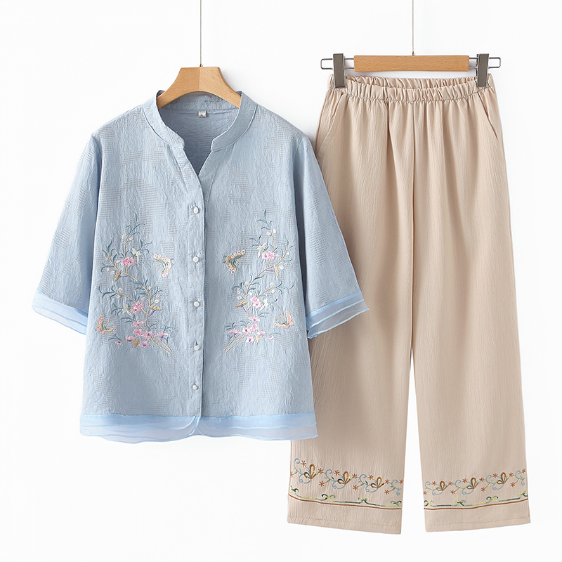 おばあちゃんの夏スーツ、お母さんの夏スーツ、七分袖シャツ、中高年女性のシャツ、夏の新しい中国服