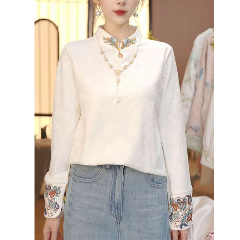 新中式国风立领盘扣打底衫女士秋冬新款长袖T恤刺绣衬衫内搭上衣