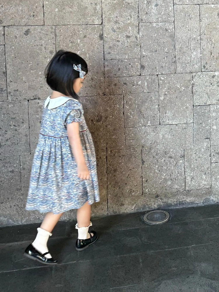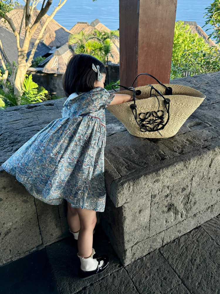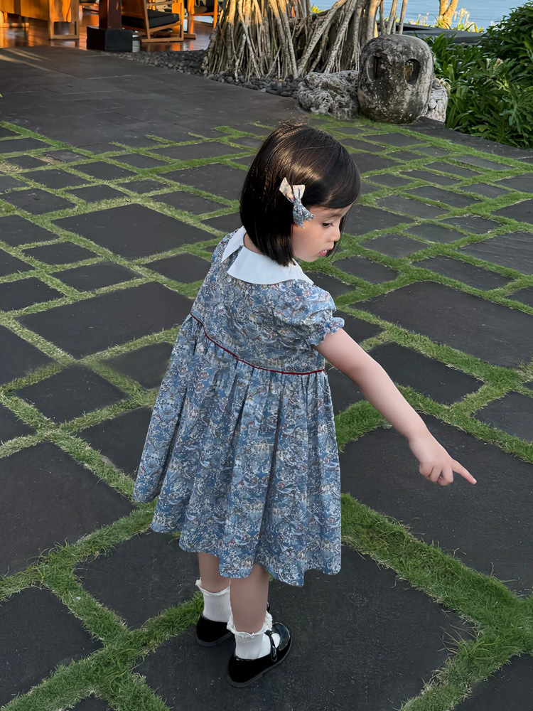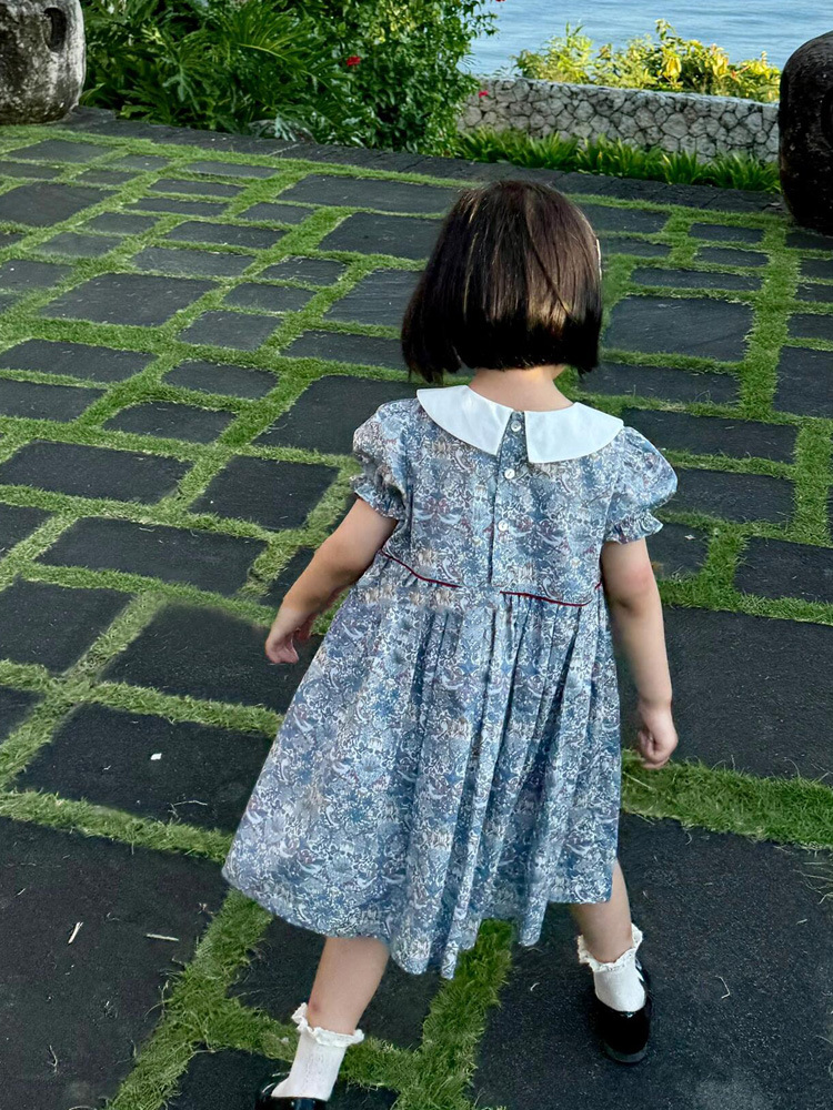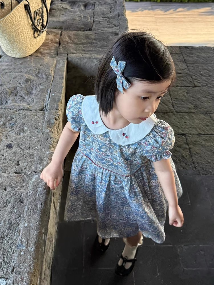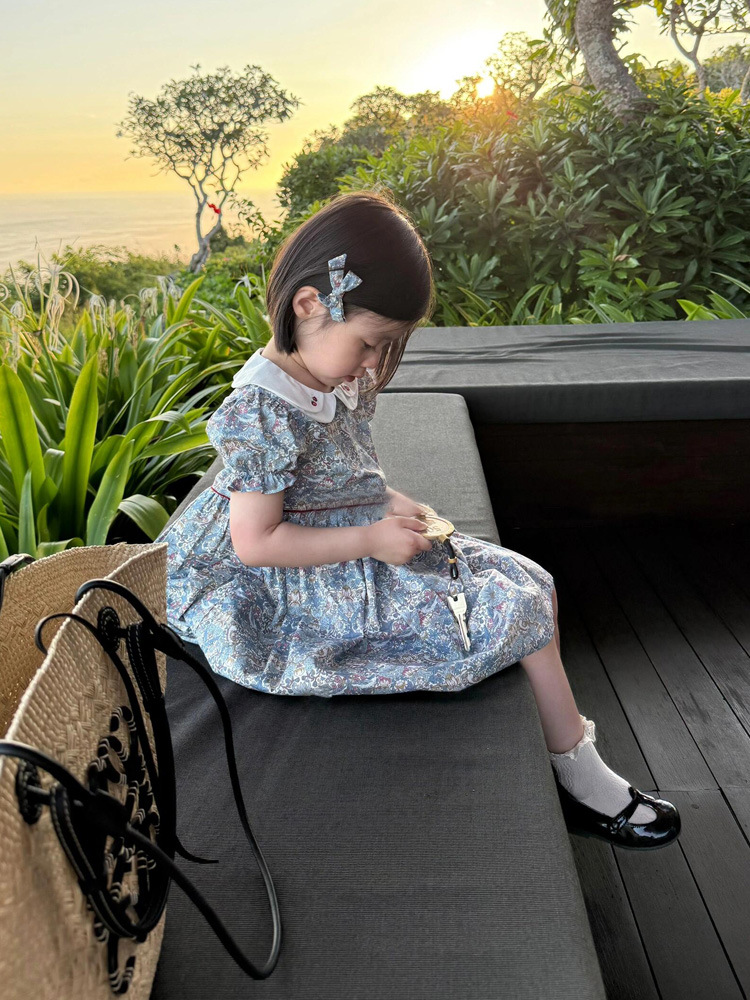 跨境夏季女童复古短袖娃娃领印花裙洋气短袖蓝色碎花连衣裙