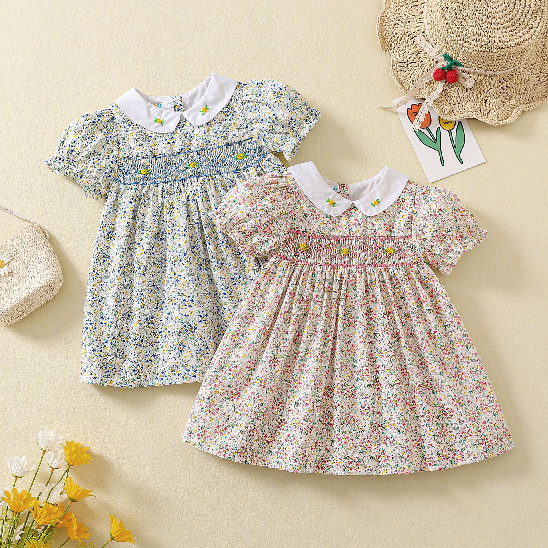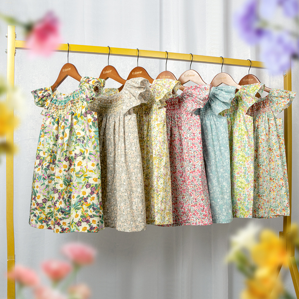 2026年北欧夏の新作女の子用花柄ケーブル編みワンピース、女の子用牧歌風ワンピース