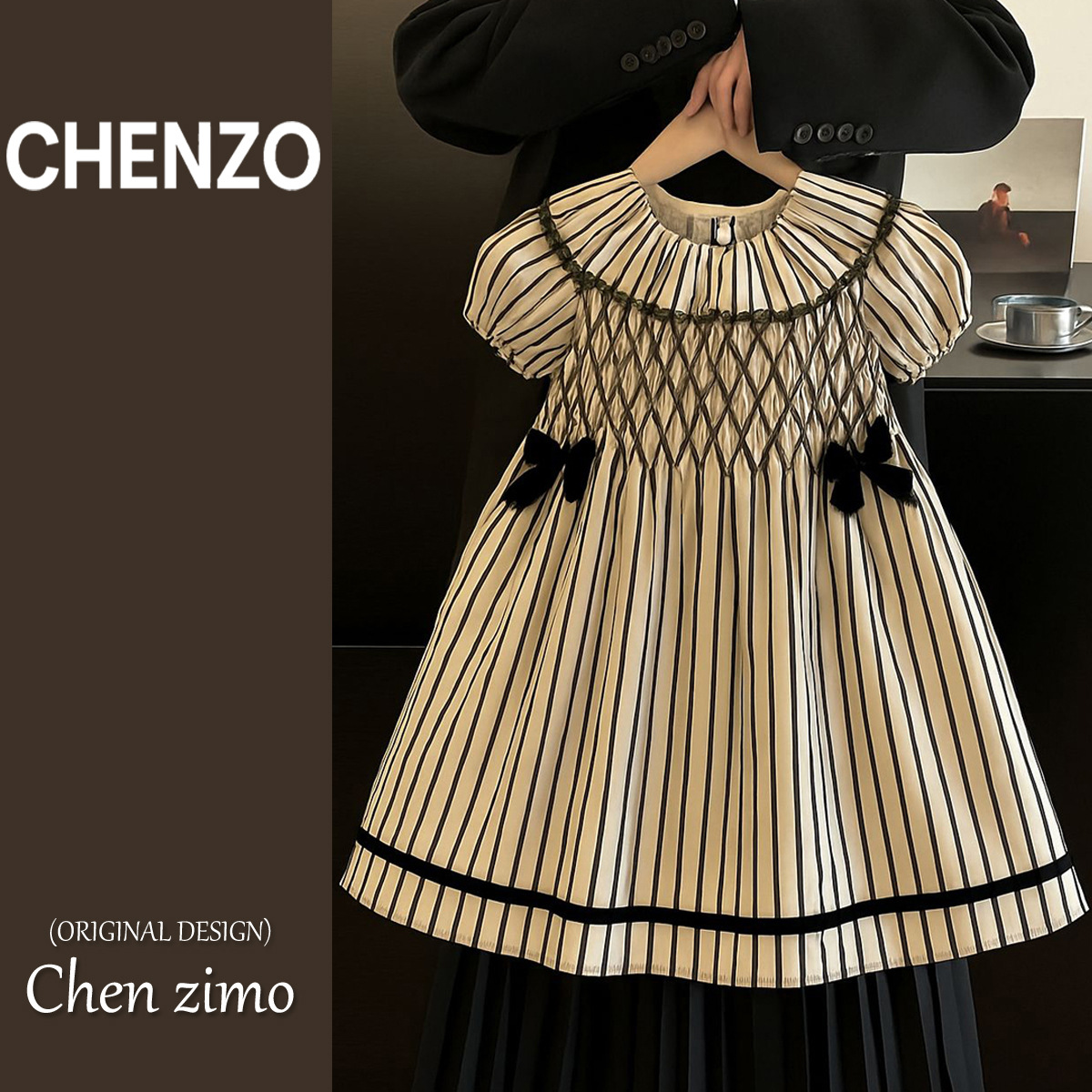 女童连衣裙2025新款手工打揽连衣裙条纹短袖日常裙子纯棉夏季英伦