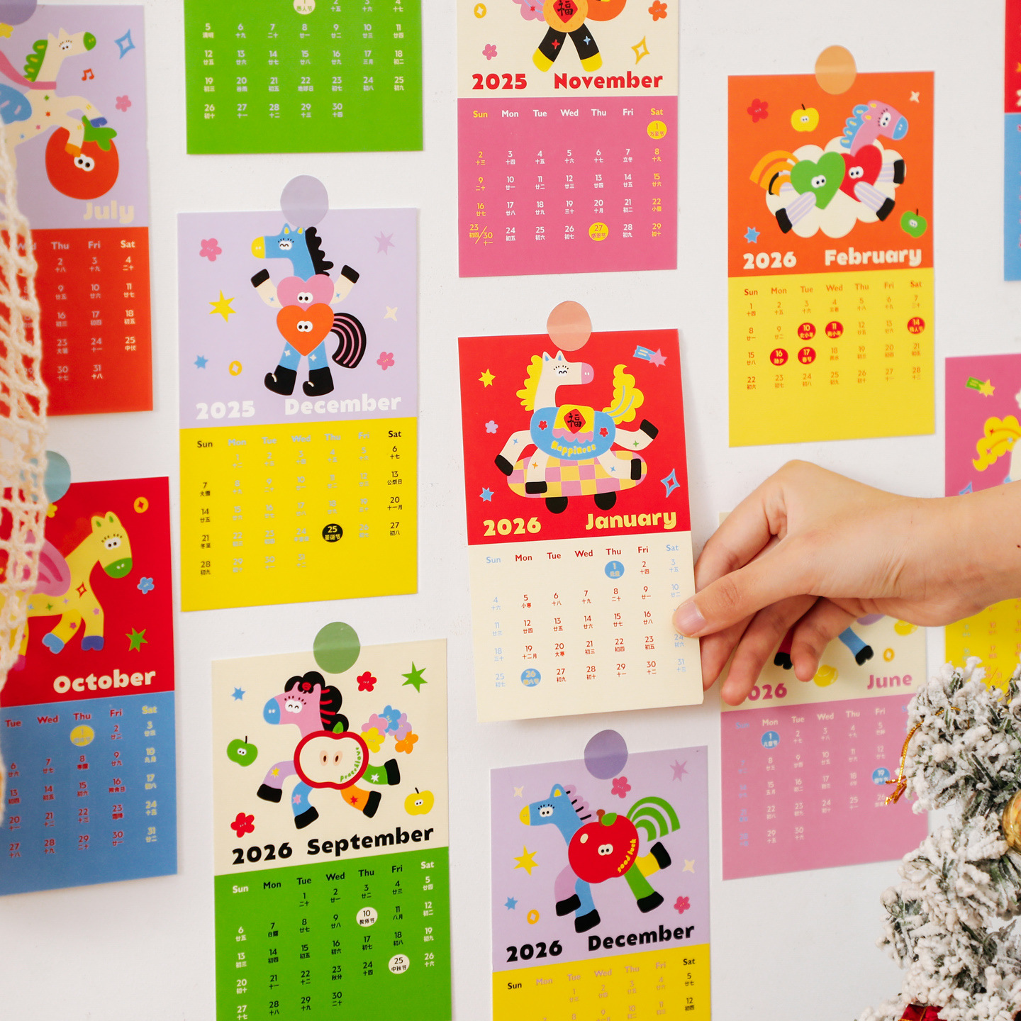 多巴胺七彩马年日历可爱装饰卡片卧室客厅拍照背景墙面装饰明信片