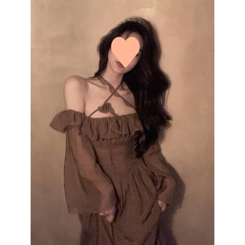 韓国の優しいスタイルのワンショルダーグラデーションスプライシングフラワードレス秋冬デザインスリムフィットロングスカート