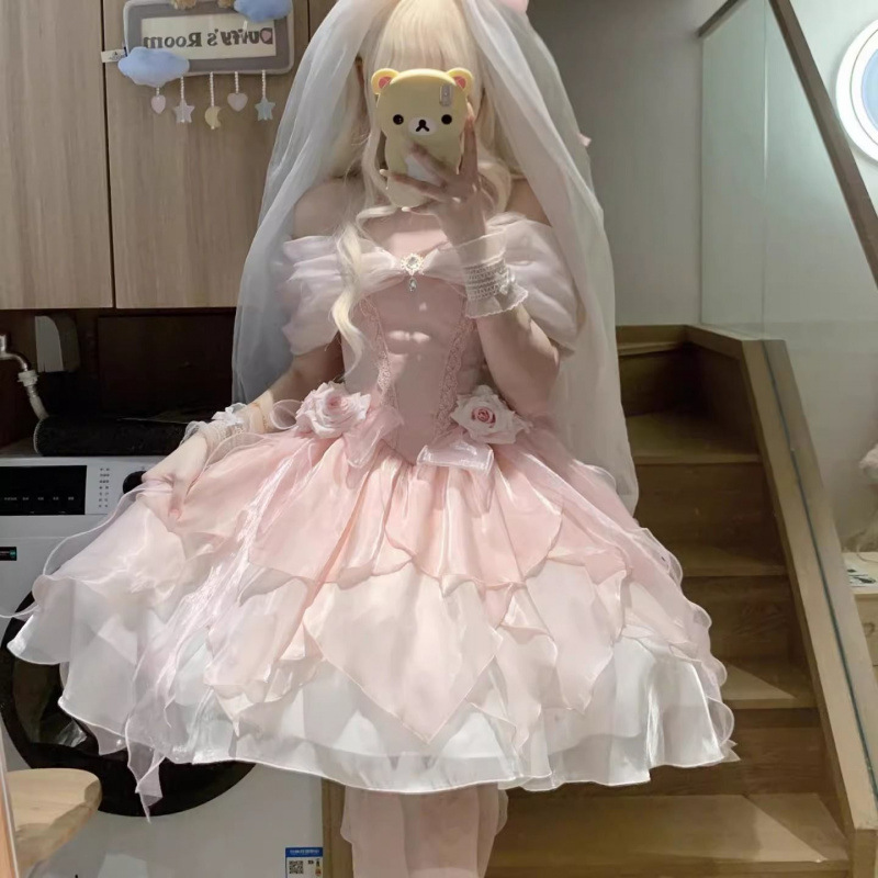 ハートビートリトルフラワーフェアリーワンショルダーガールドレスロリータピーチピンクスカートショートドレス