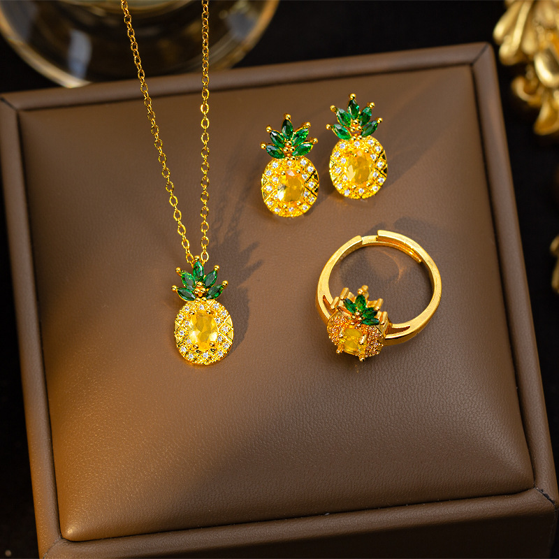 钛钢项链女新款芬达石黄钻菠萝创意水果绿钻耳钉开口戒指套装饰品