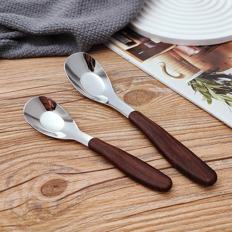 304不锈钢勺子仿木纹手柄餐勺宝宝辅食喂养勺汤匙儿童餐具元宝勺