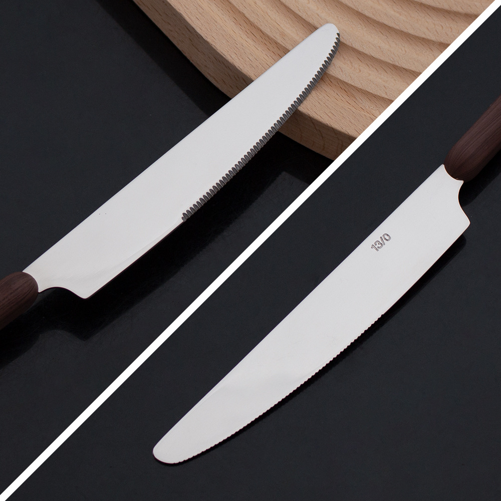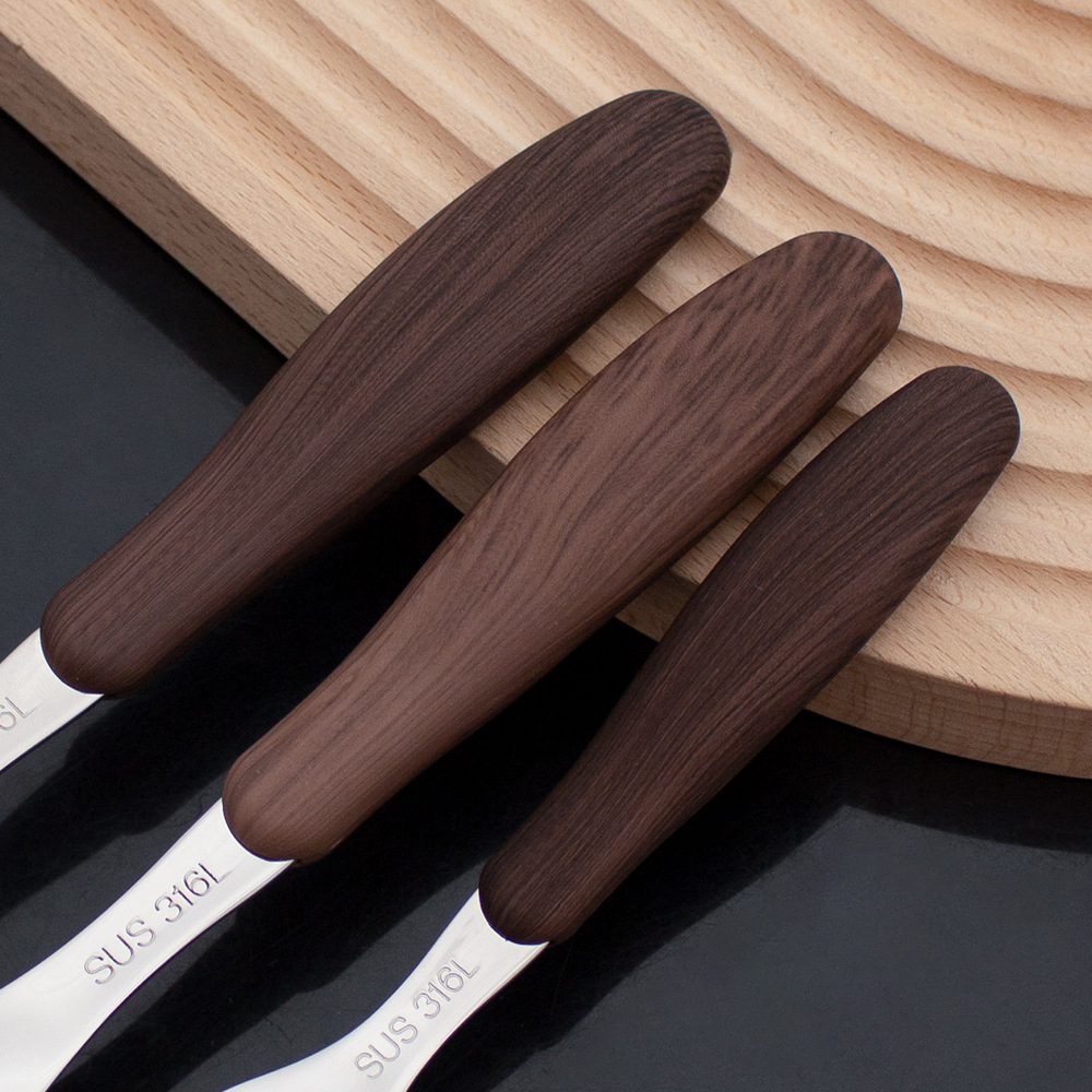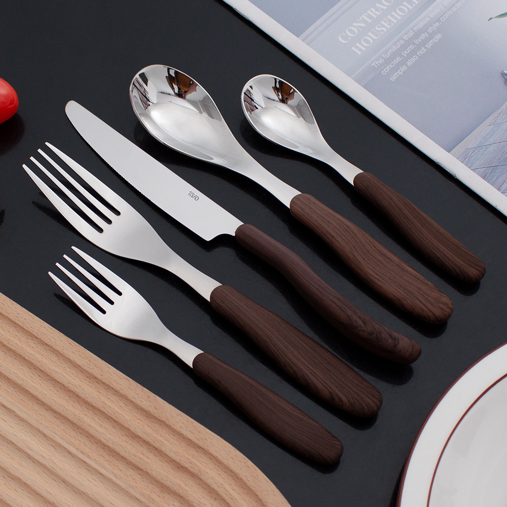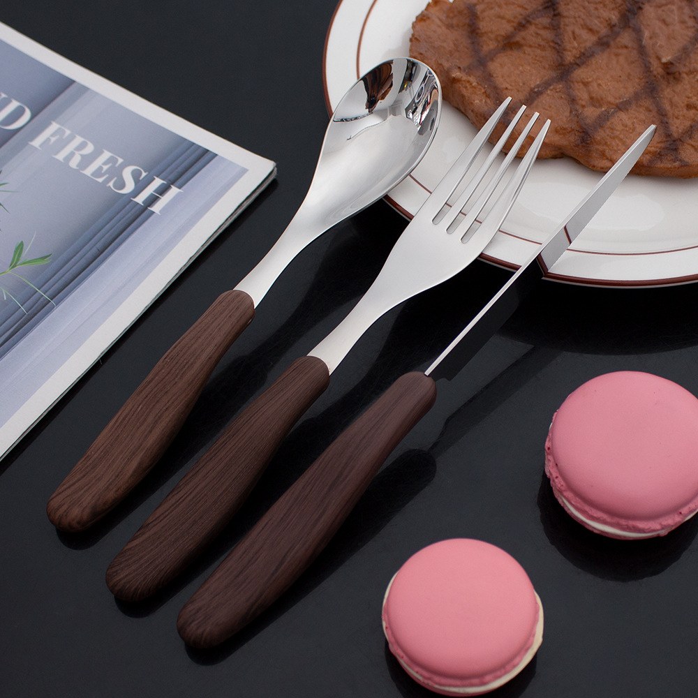 不锈钢木柄仿木纹刀叉勺餐具 家用西餐厅创意ins风调羹勺甜品勺