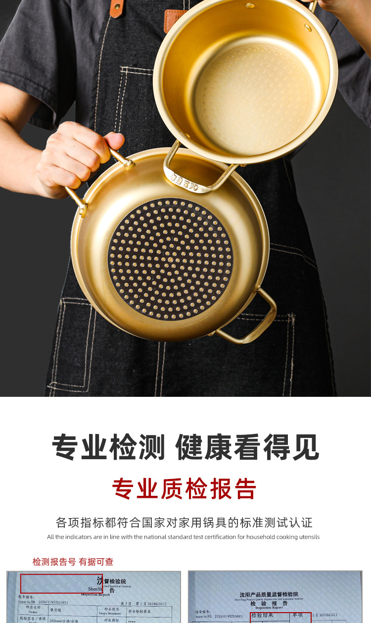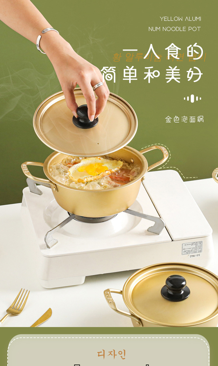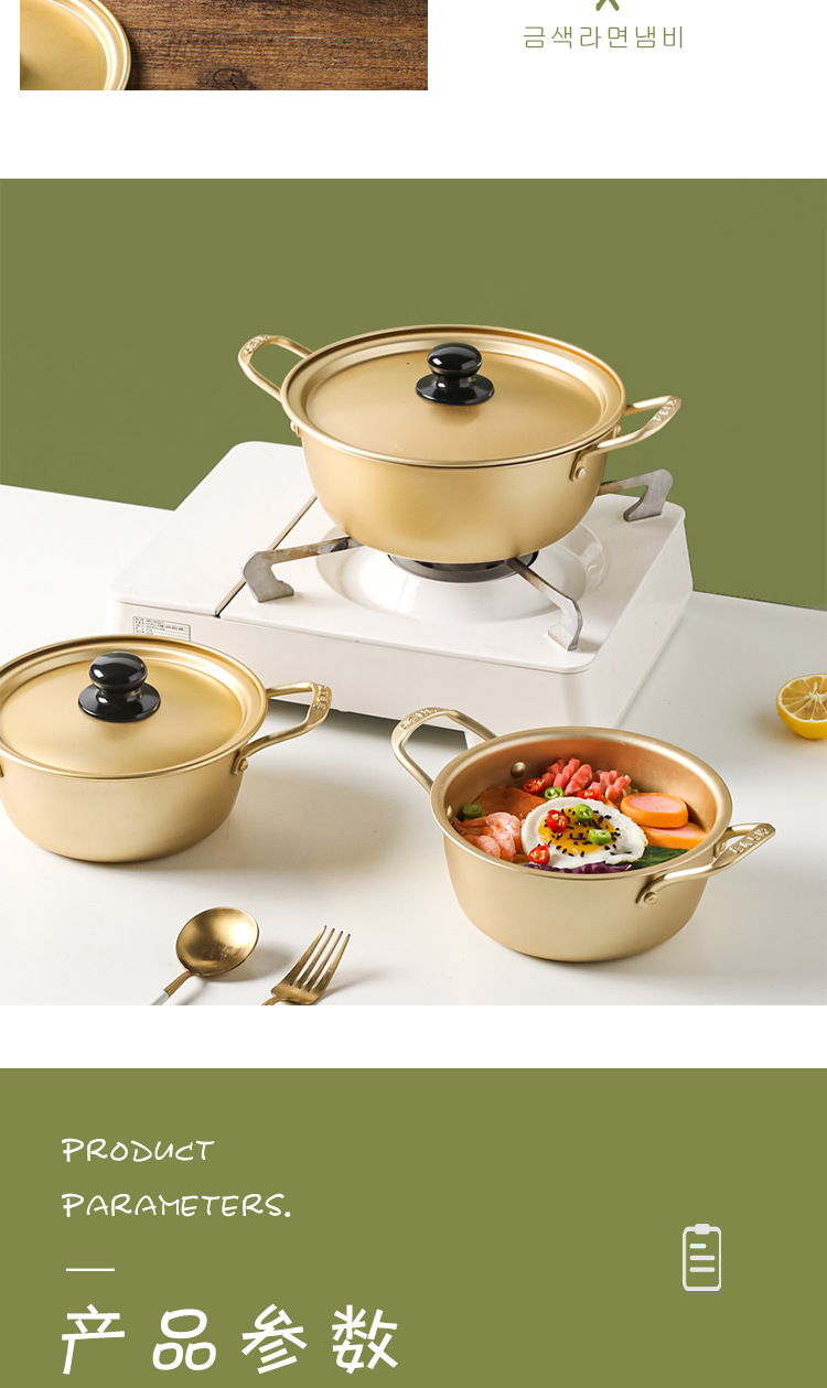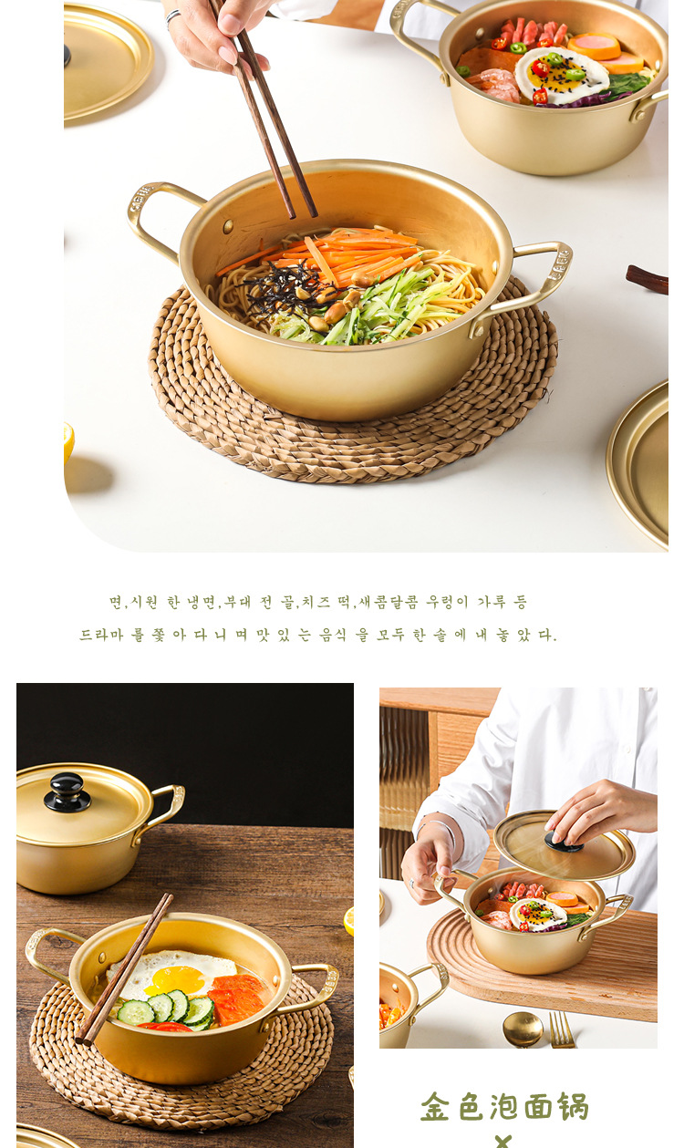 韓国式の黄色のアルミニウムのラーメンのカップラーメンの鍋の韓劇の同じ型のインスタントラーメンの鍋のホテルのレストランのラーメンの鍋の双耳は蓋のスープの鍋を持っています。