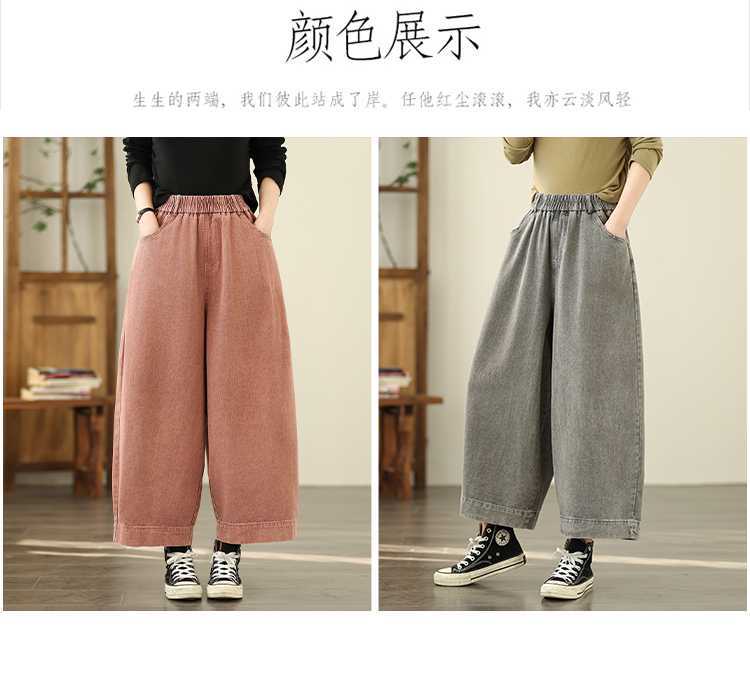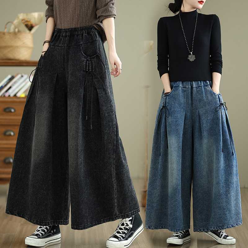 实拍秋冬复古新中式个性水洗牛仔阔腿裤宽松大码个性显瘦直筒裤女