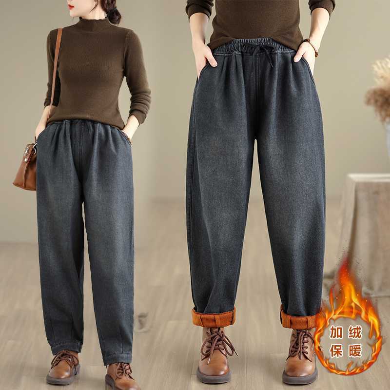 秋季新款实拍休闲大码文艺范水洗牛仔松紧腰九分哈伦裤女