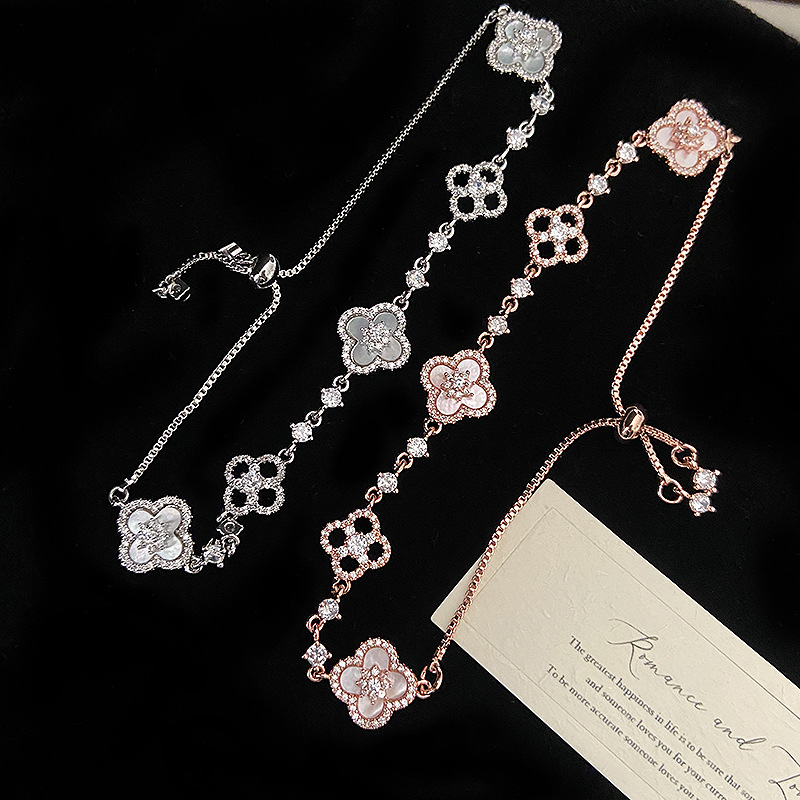 天然ピンクシェル四つ葉の花ジルコン伸縮式ブレスレット 女性用 中空デザイン エレガントで繊細な高級感のある手飾り
