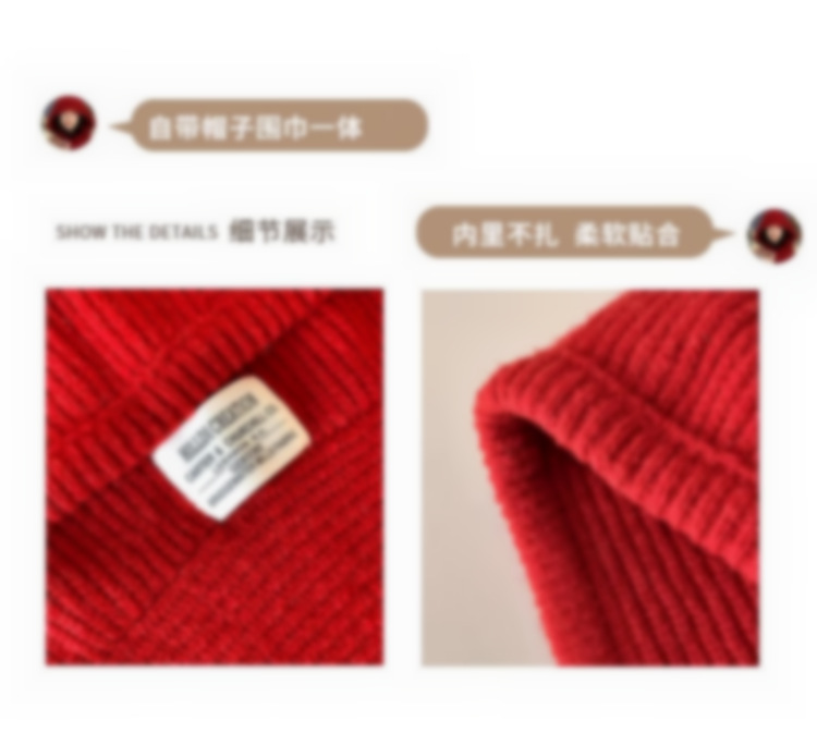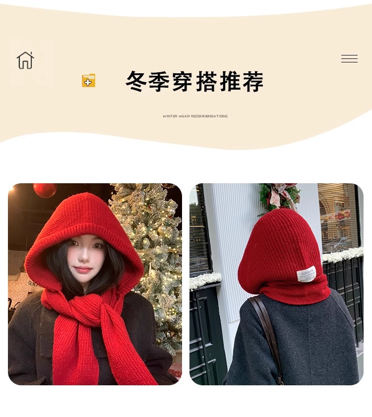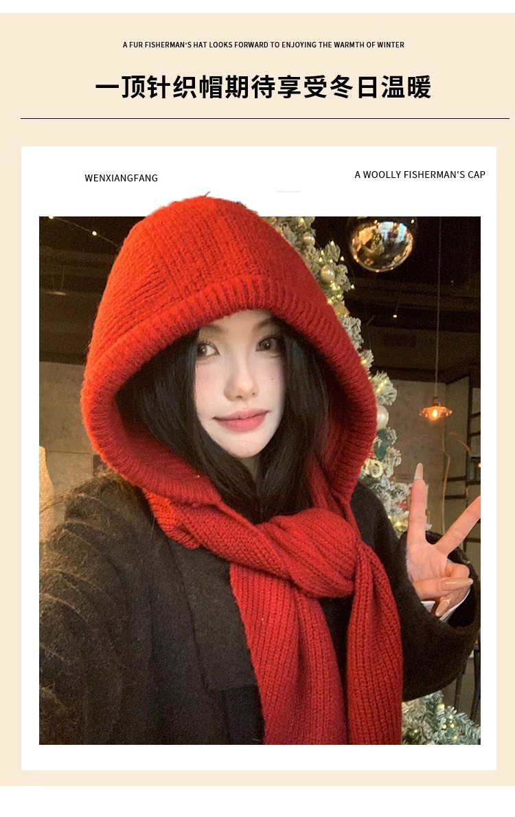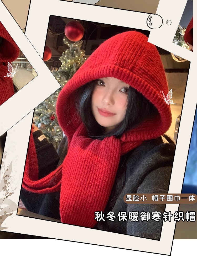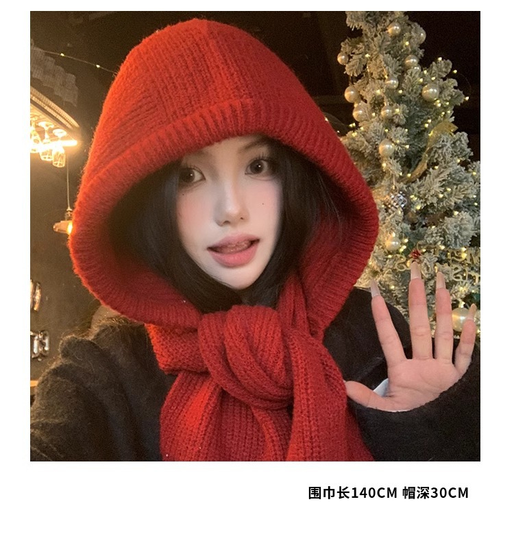升级红色巴拉克拉法帽女连帽围脖秋冬季披肩针织毛线帽子围巾一体