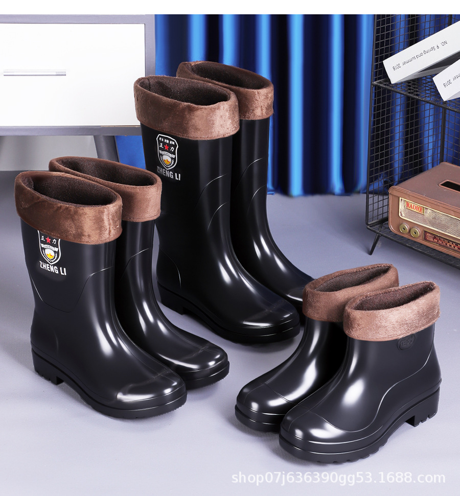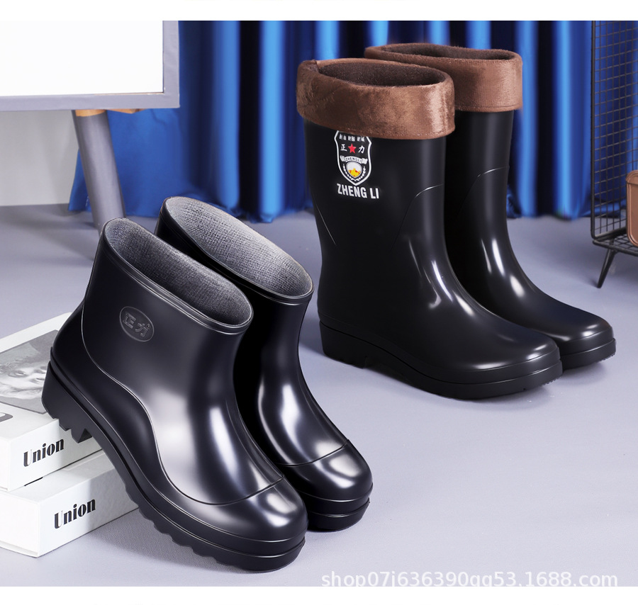 厚みのある労働保護メンズレインブーツ、ハイチューブショートレインブーツ、防水、滑り止め、厚みのあるベルベットカバー、耐酸性および耐アルカリ性ウォーターシューズ、キッチンラバーブーツ