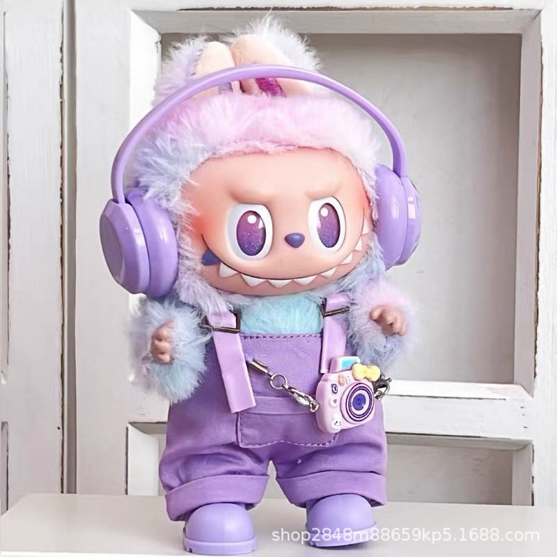 17cm一二三代l拉布布娃衣Labubu可爱背带裤耳机套装坐坐派对潮服