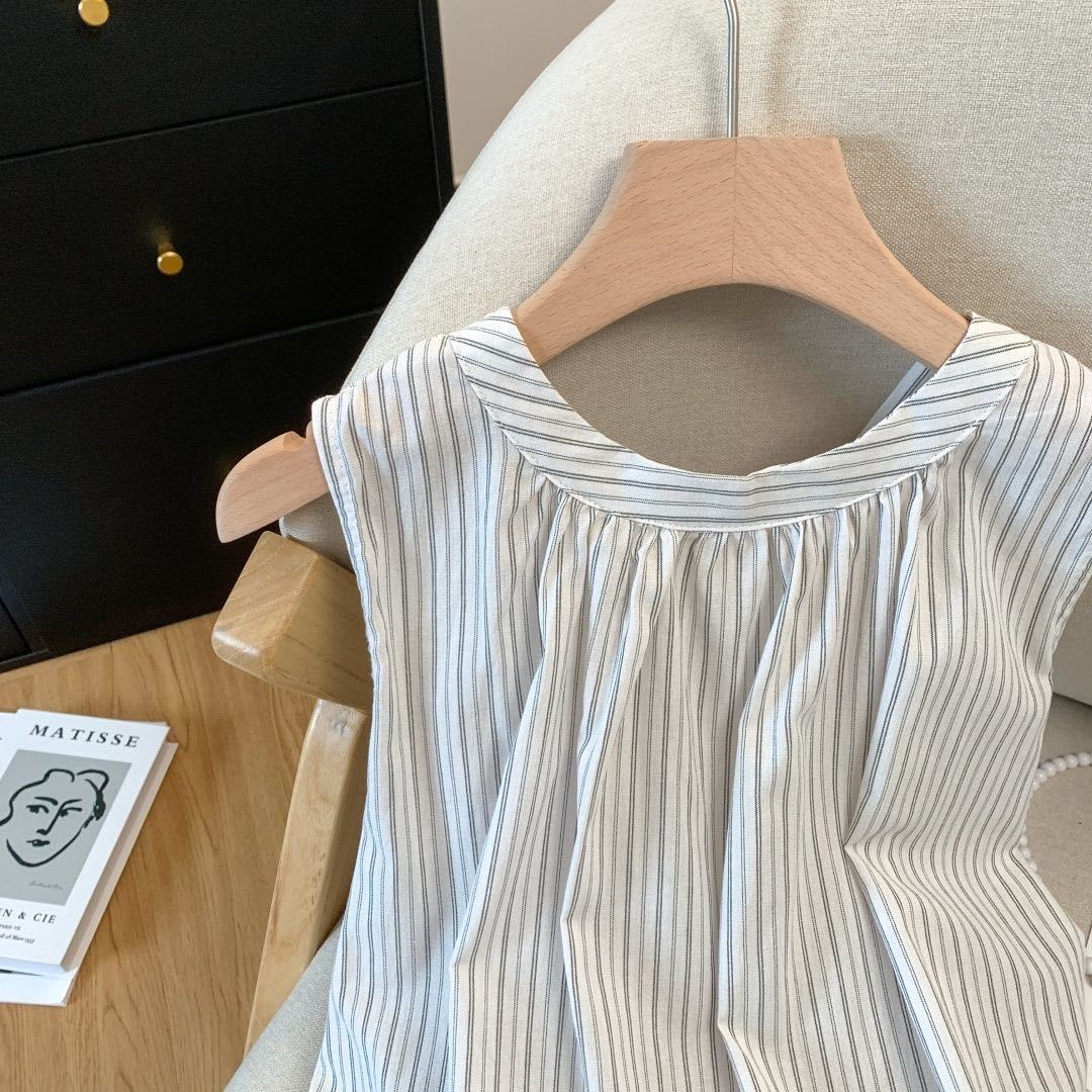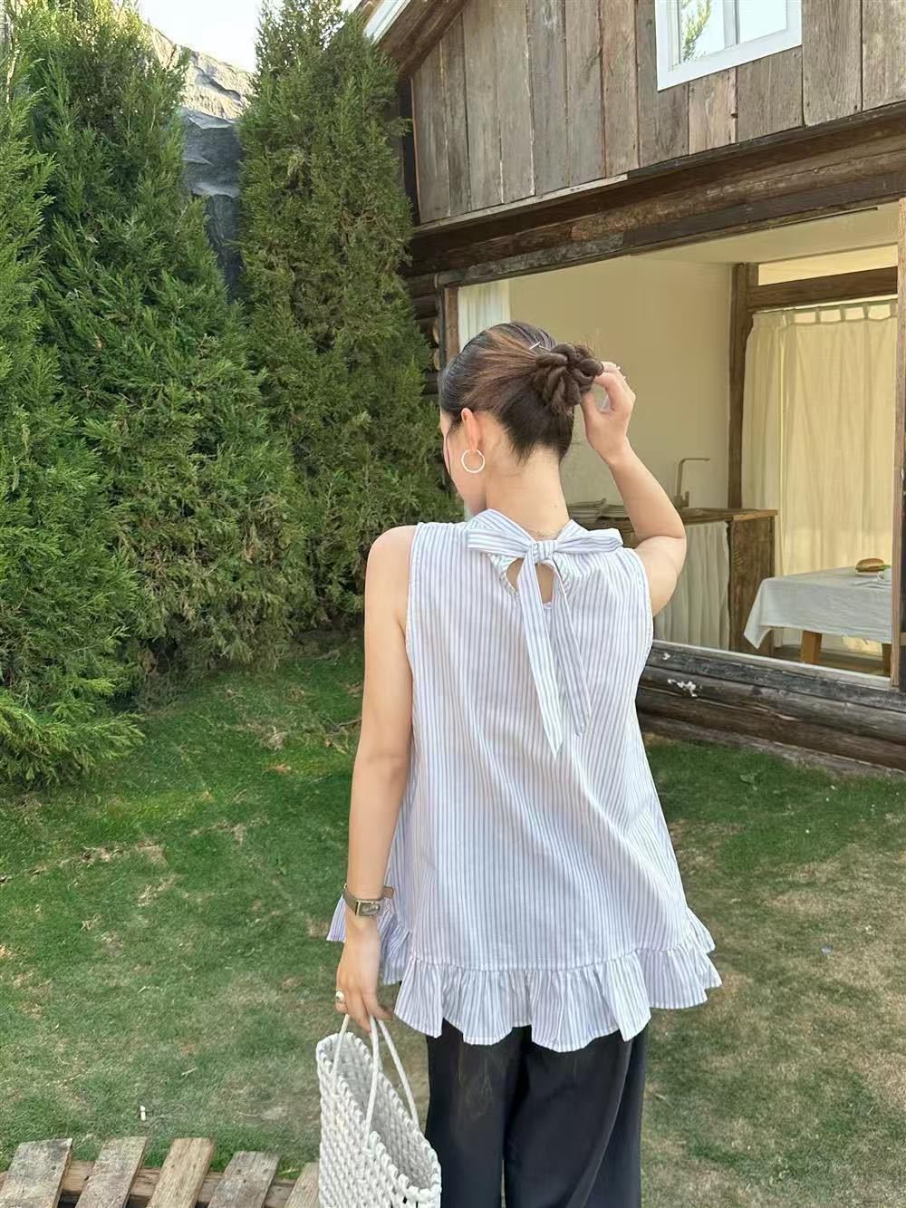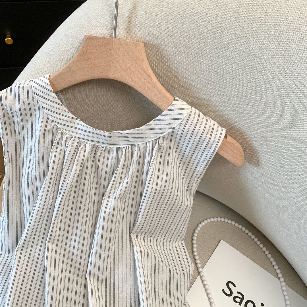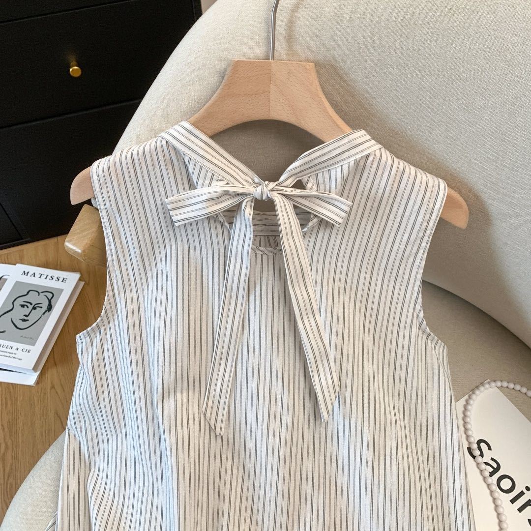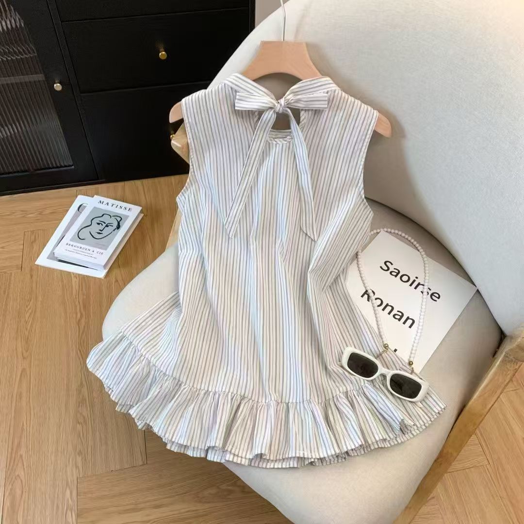 フレンチレトロストライプレースアップノースリーブシャツレディース夏デザインニッチルーズ甘い年齢軽減オフショルダートップ