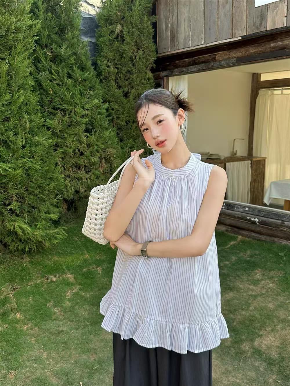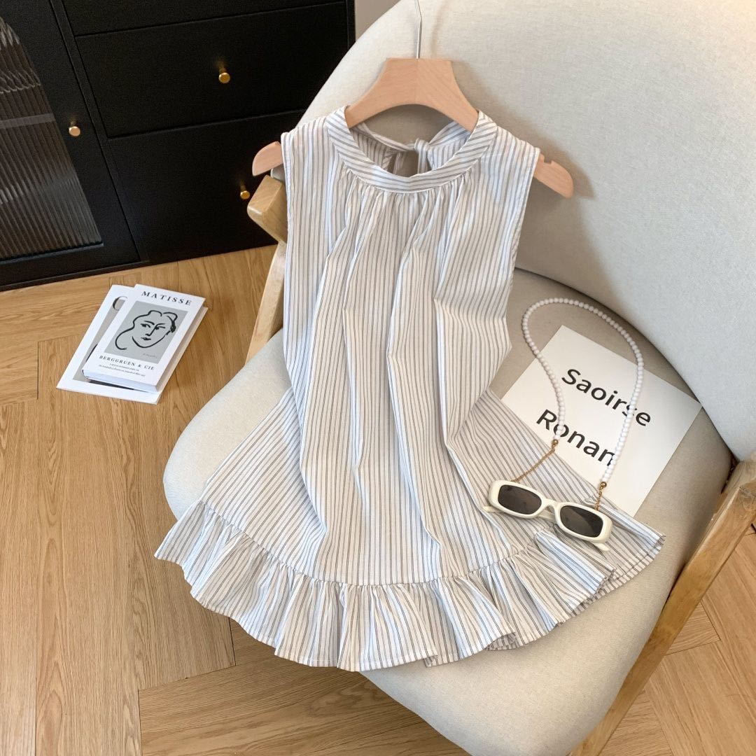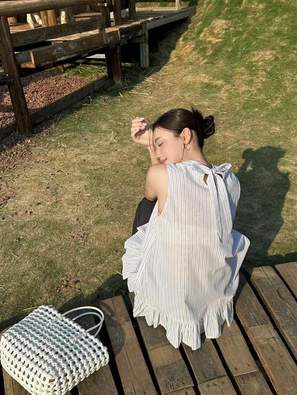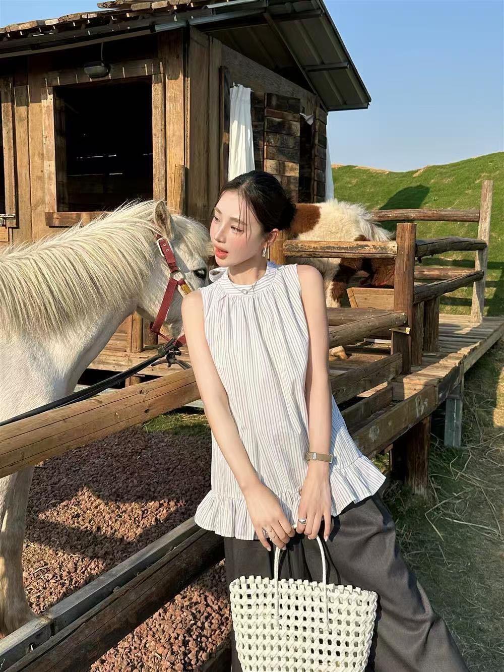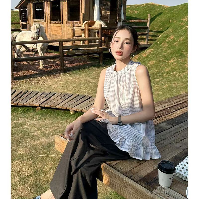 フレンチレトロストライプレースアップノースリーブシャツレディース夏デザインニッチルーズ甘い年齢軽減オフショルダートップ
