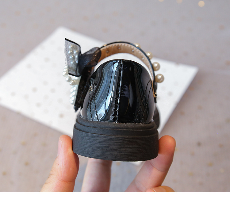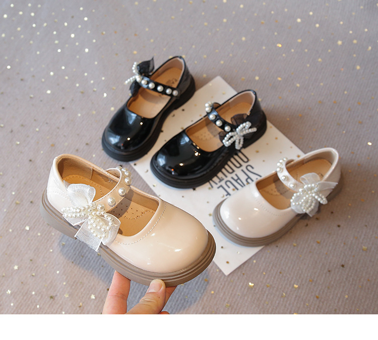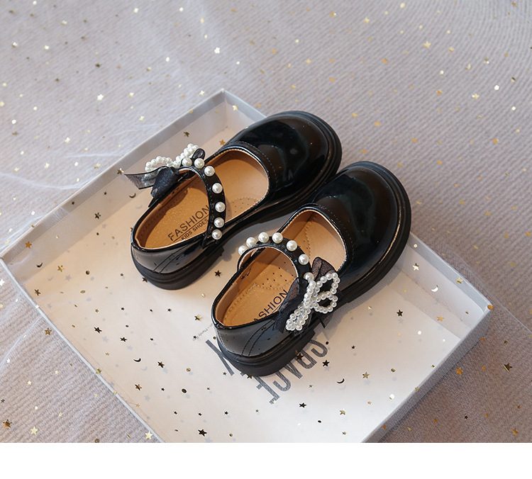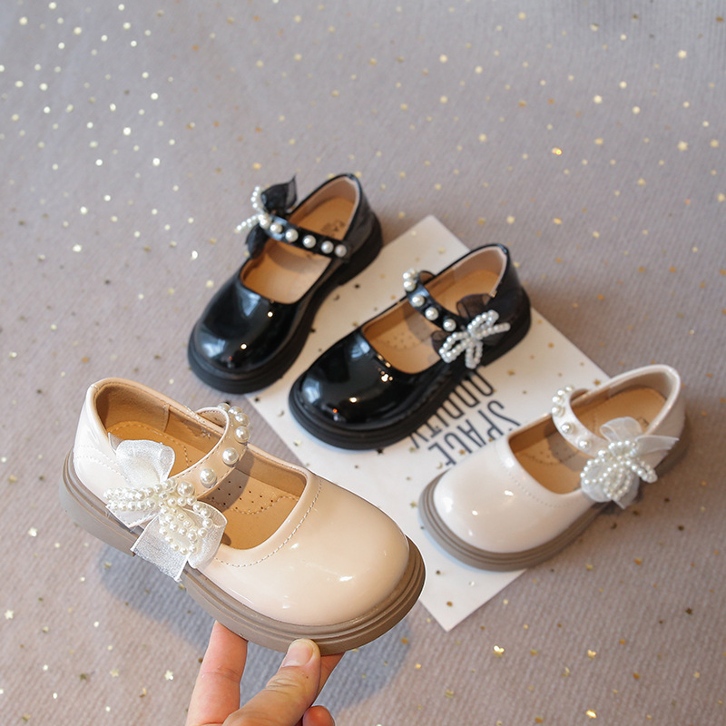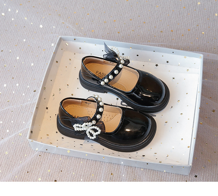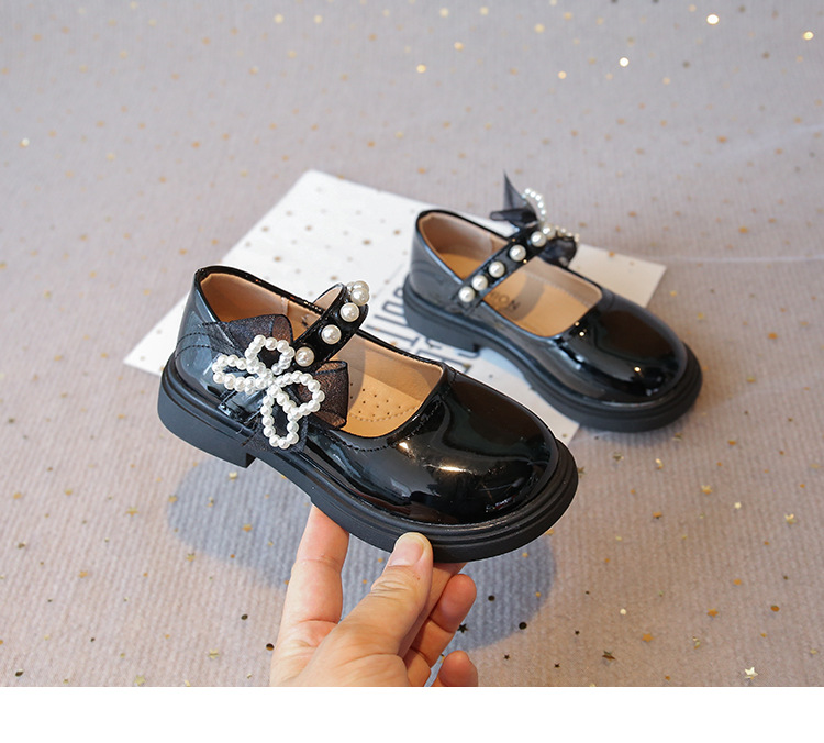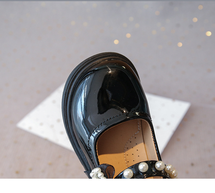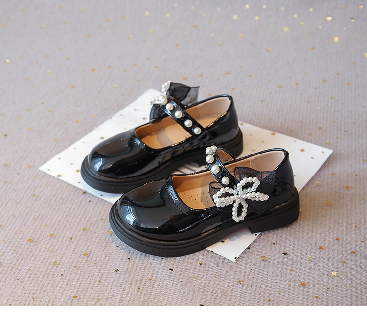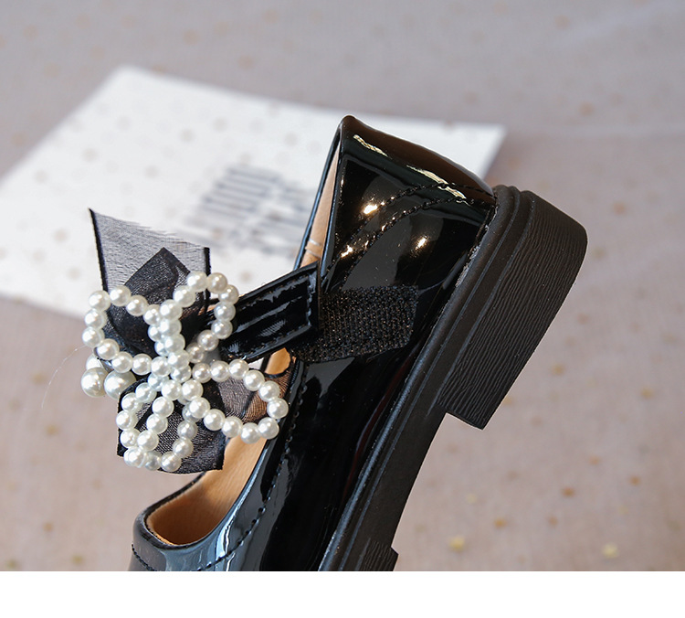 子供の英国スタイルの黒の小さな革靴 2025 秋の新しい女の子のファッションビーズリボンパテントレザープリンセスシューズ