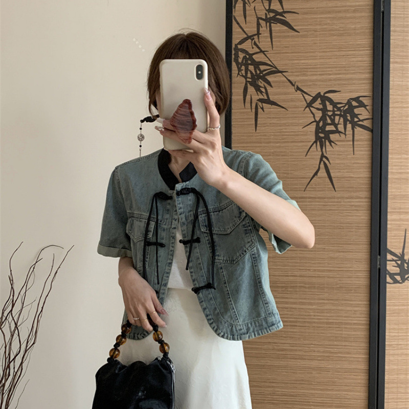 中国風の新しい中国風のバックルレトロ半袖シャツジャケット夏の新しい女性のゆったりとした気質のショートデニムトップ