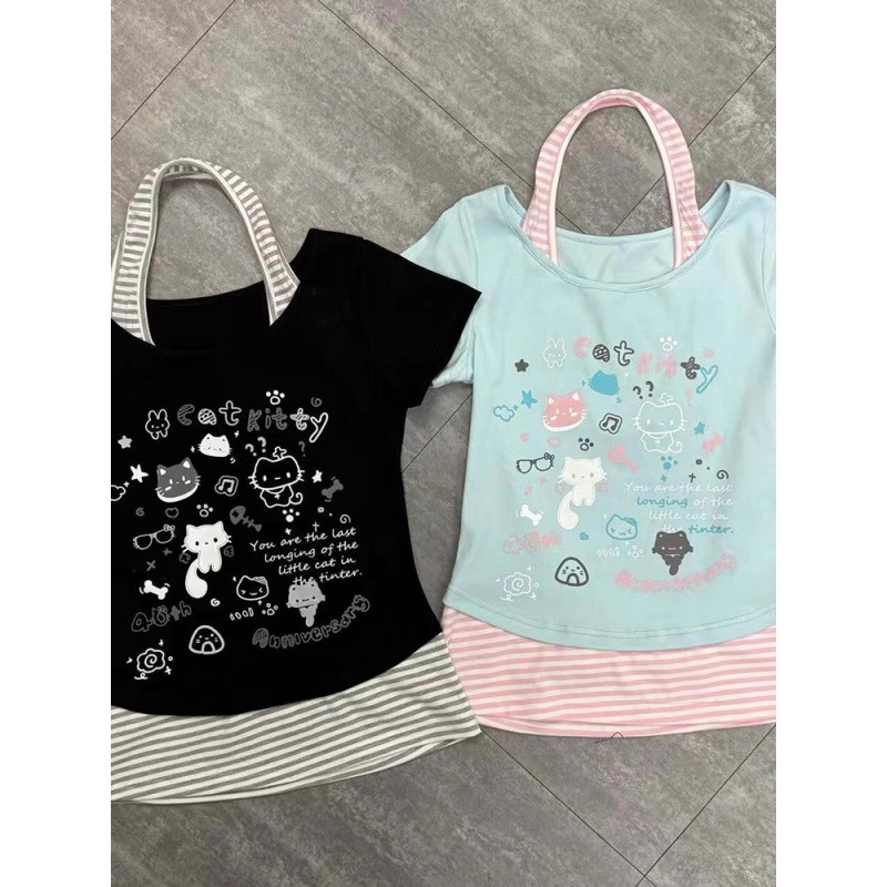 かわいいデザインニッチストライプホルターネックかわいい猫半袖Tシャツレディース夏ホームスタイルスリムフィットショートトップ