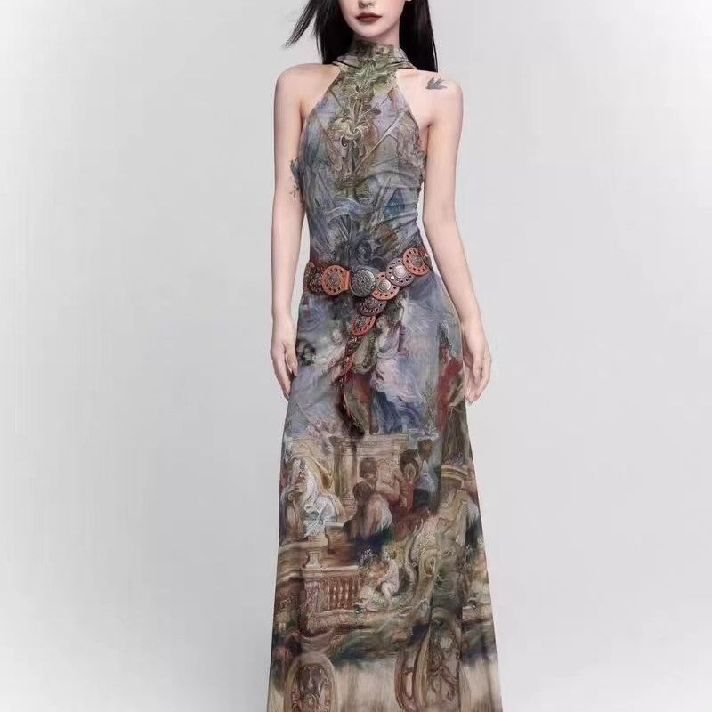 夏の新しいレトロなヨーロッパの油絵スタイルのクロスウッドリングバックレスタートルネックスリムドレスロングスカート