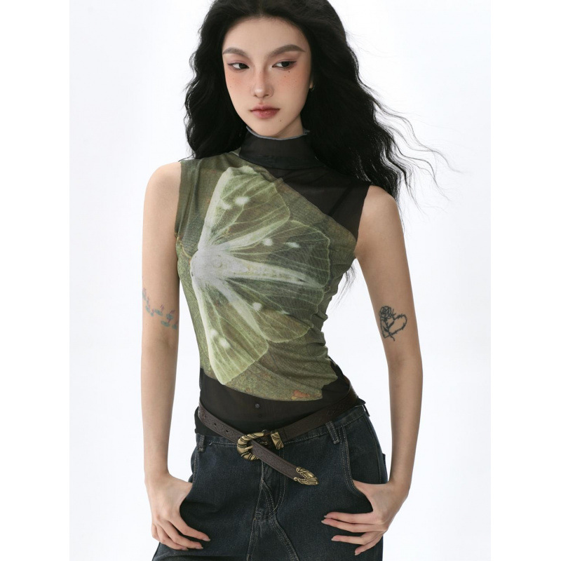 ミレニアム y2k ホットガール蝶プリントハイカラーメッシュベスト女性 2025 夏レトロスリムノースリーブレトロトップ
