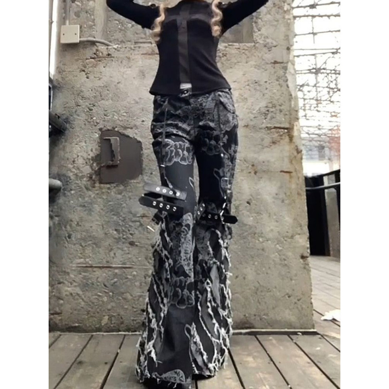 アメリカンプラスサイズの毛深いタッセルローウエストマイクロフレアパンツ女性用 2025 春パンクホットガールサブカルチャーフロアレングスパンツ