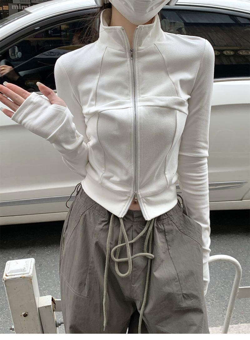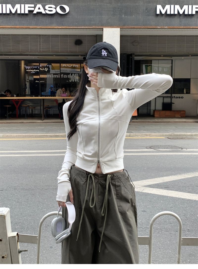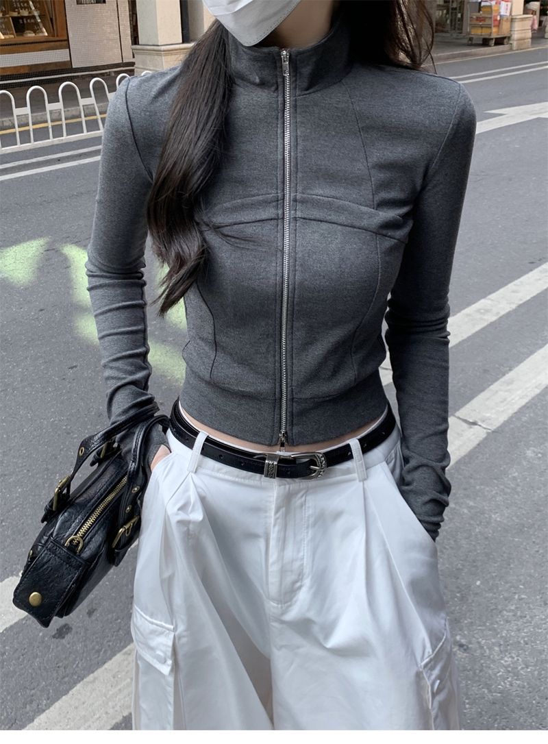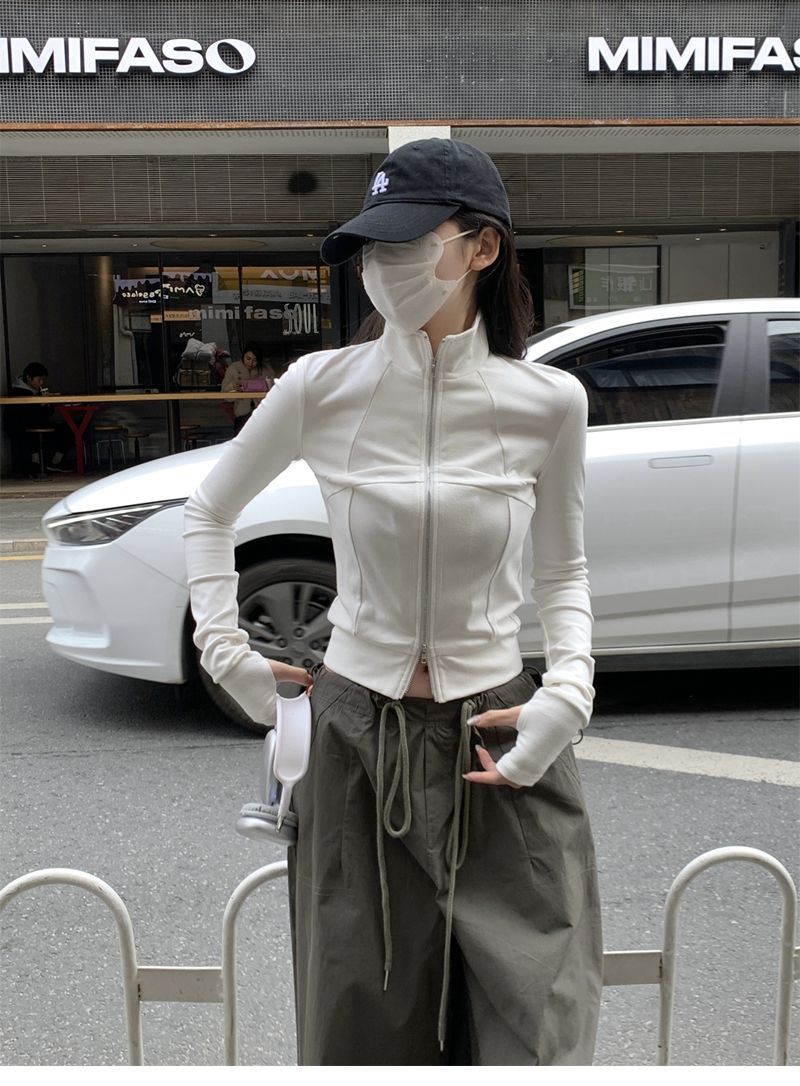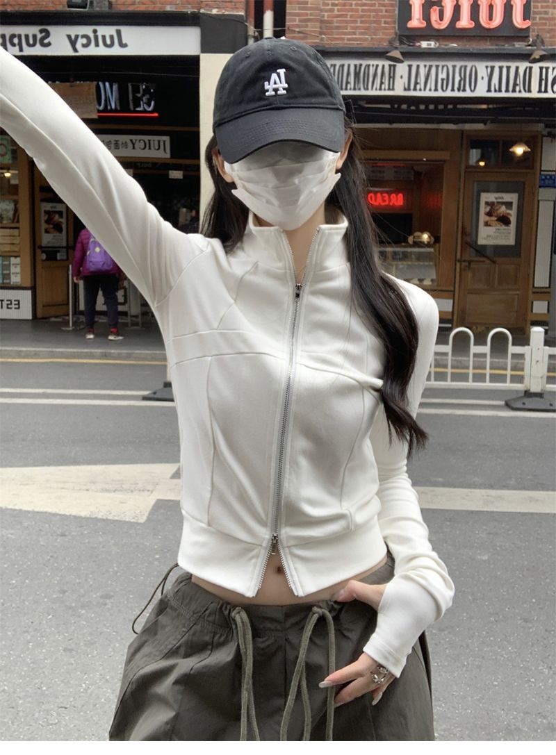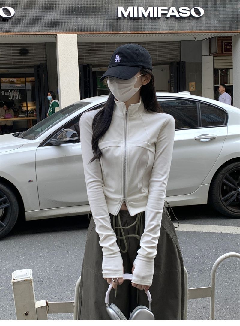 设计感螺纹拉链长袖开衫T恤外套女早秋新款纯色修身短款德绒上衣