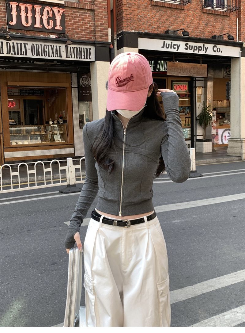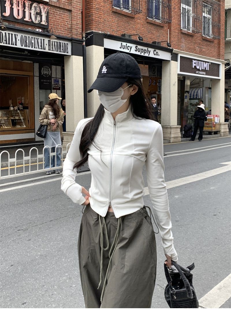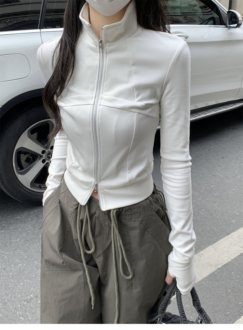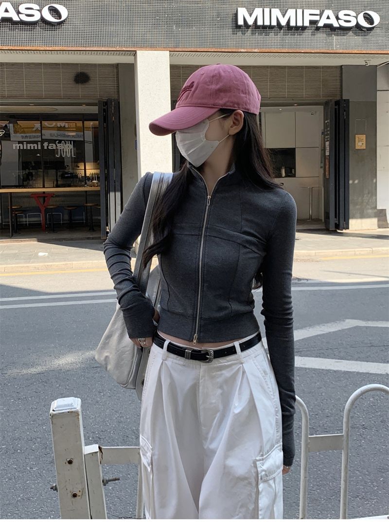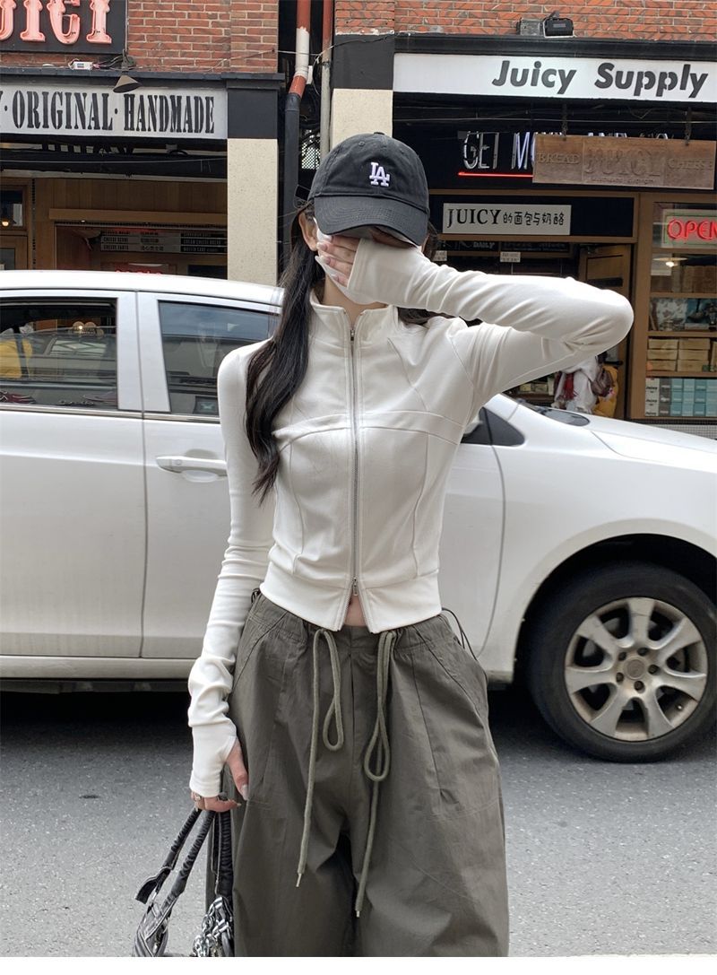 设计感螺纹拉链长袖开衫T恤外套女早秋新款纯色修身短款德绒上衣