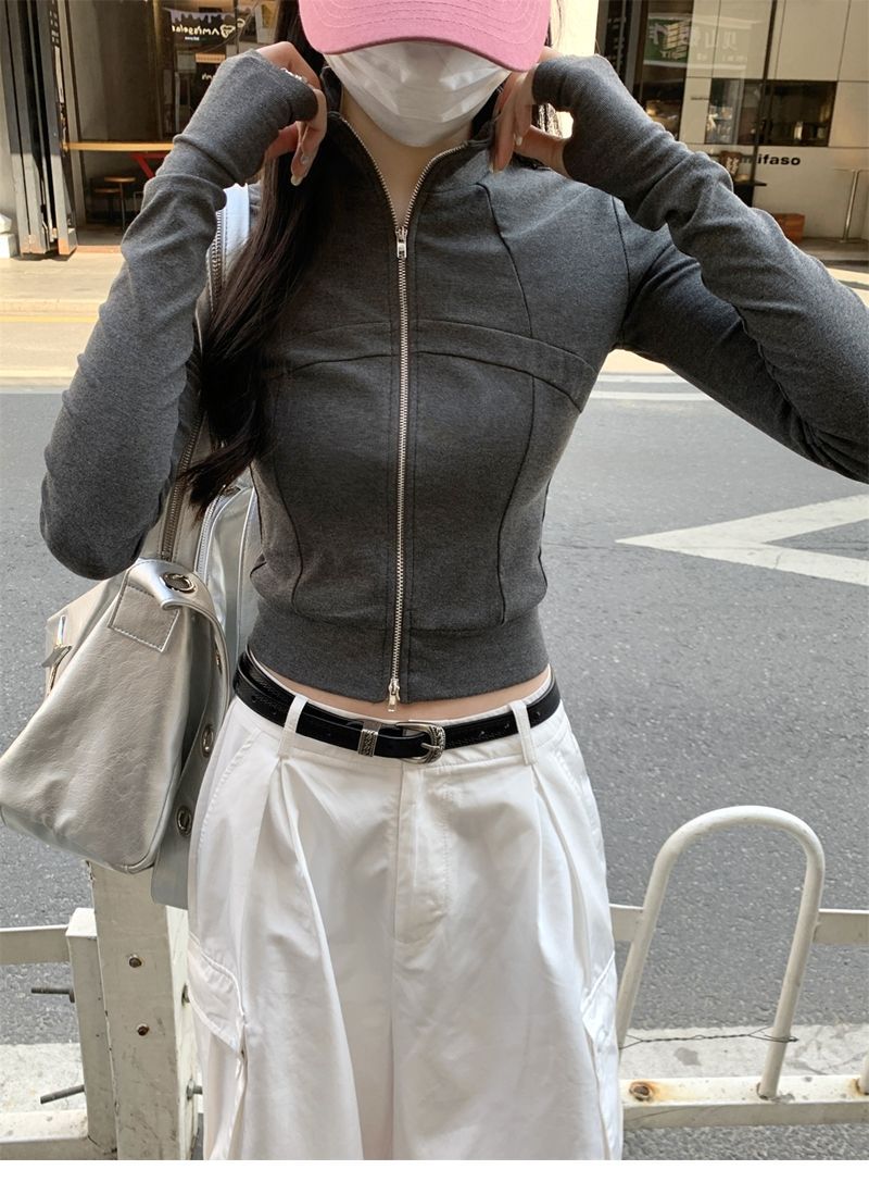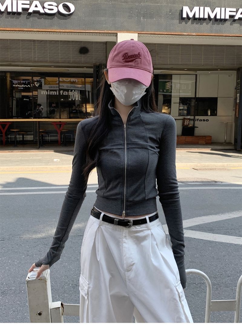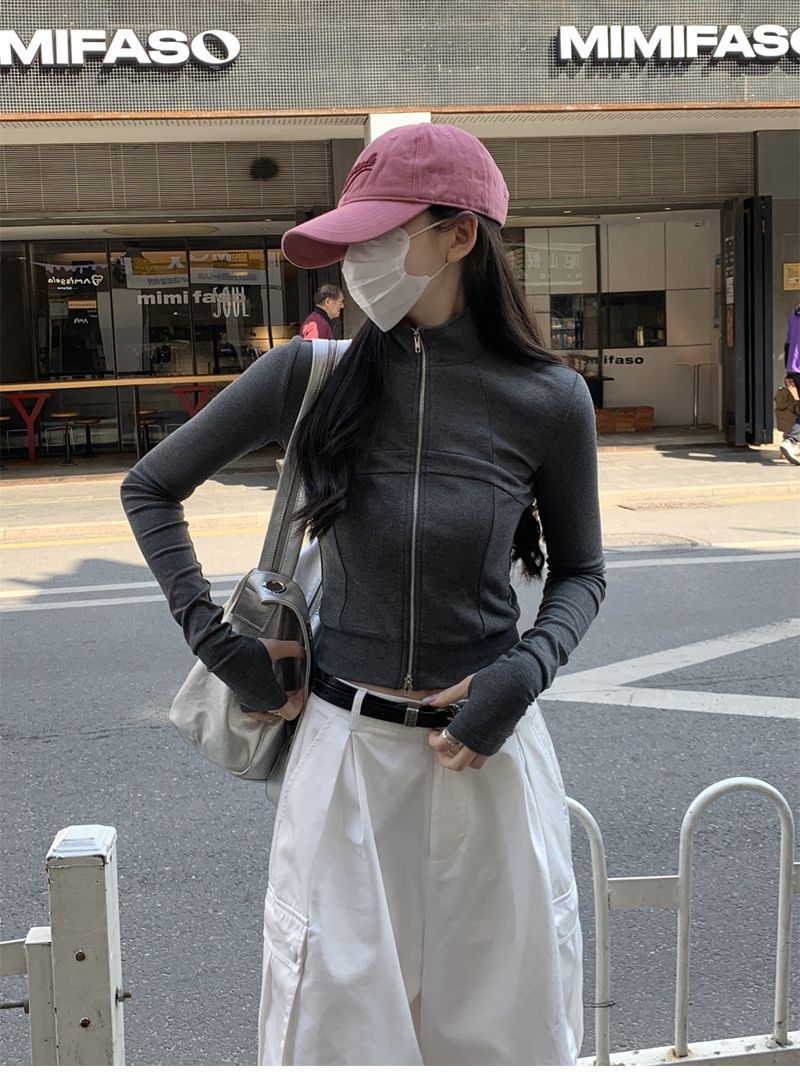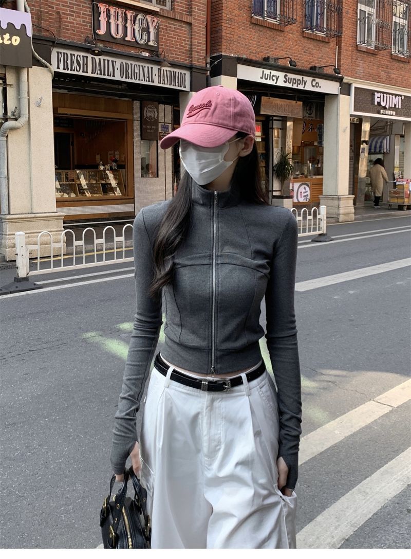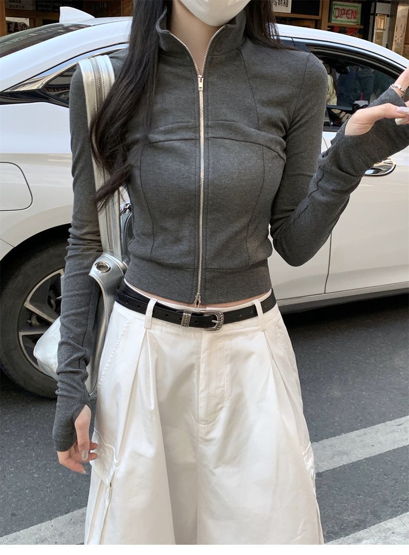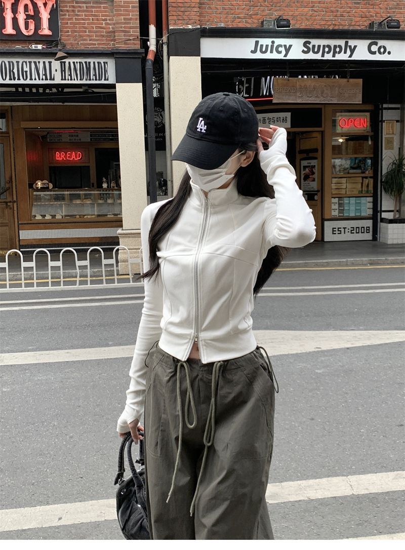 设计感螺纹拉链长袖开衫T恤外套女早秋新款纯色修身短款德绒上衣