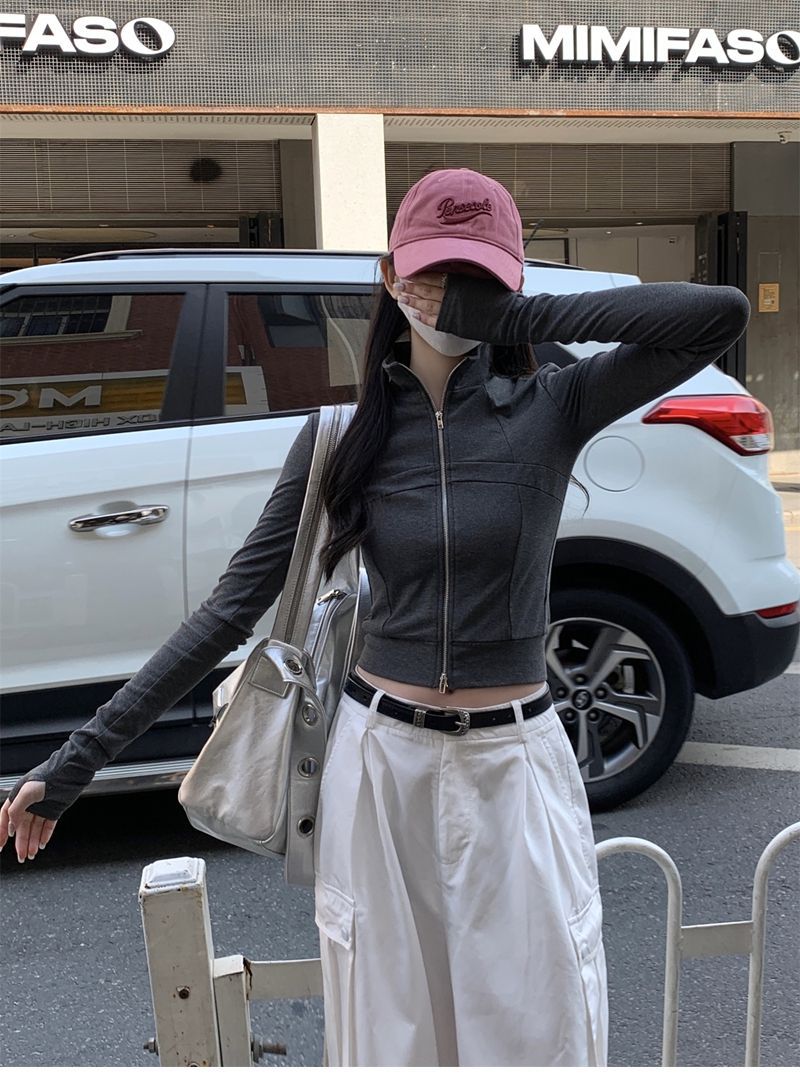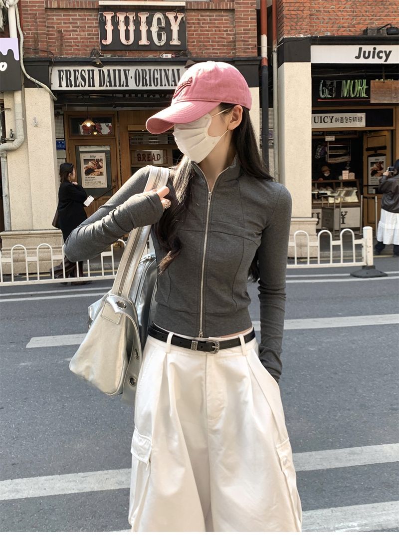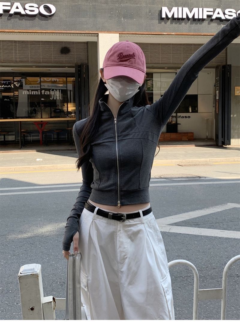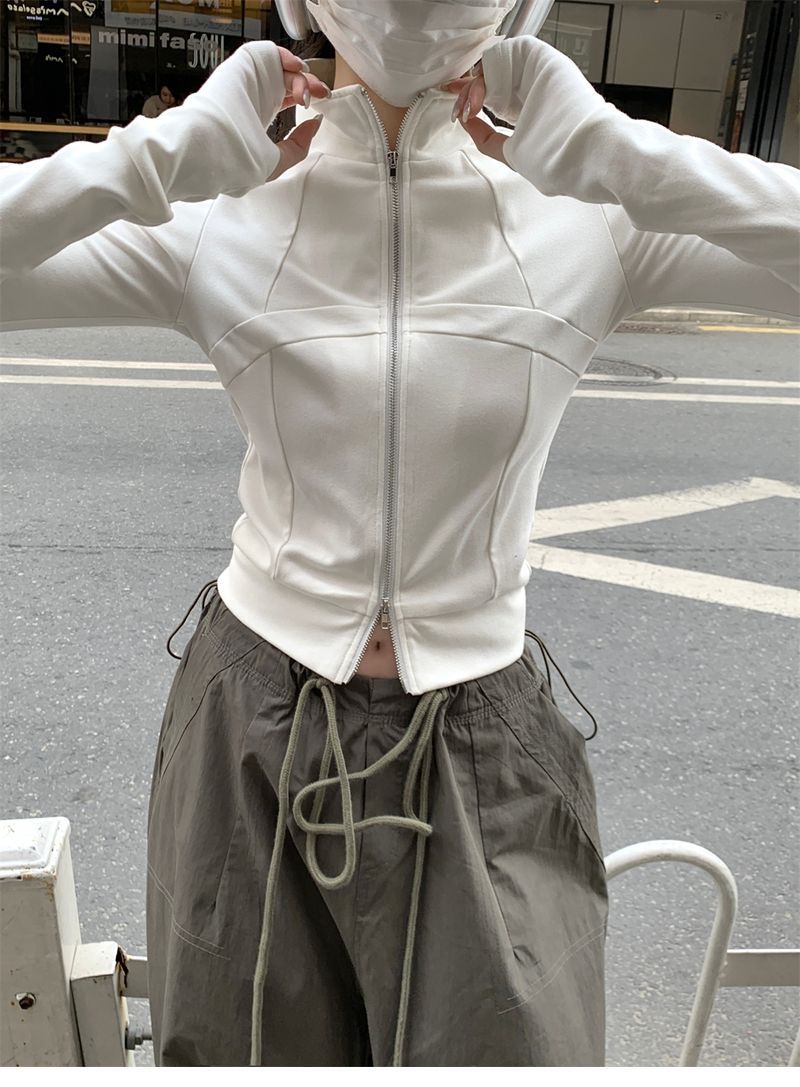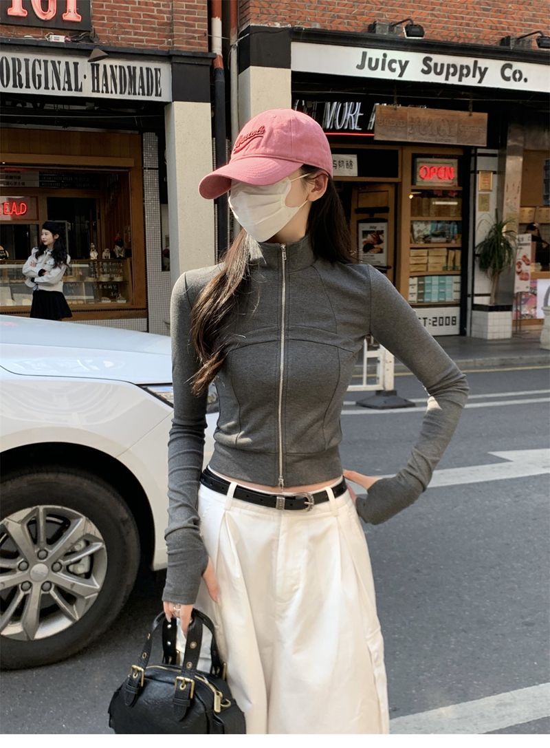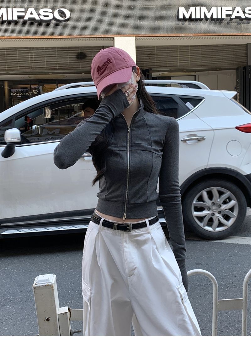 设计感螺纹拉链长袖开衫T恤外套女早秋新款纯色修身短款德绒上衣
