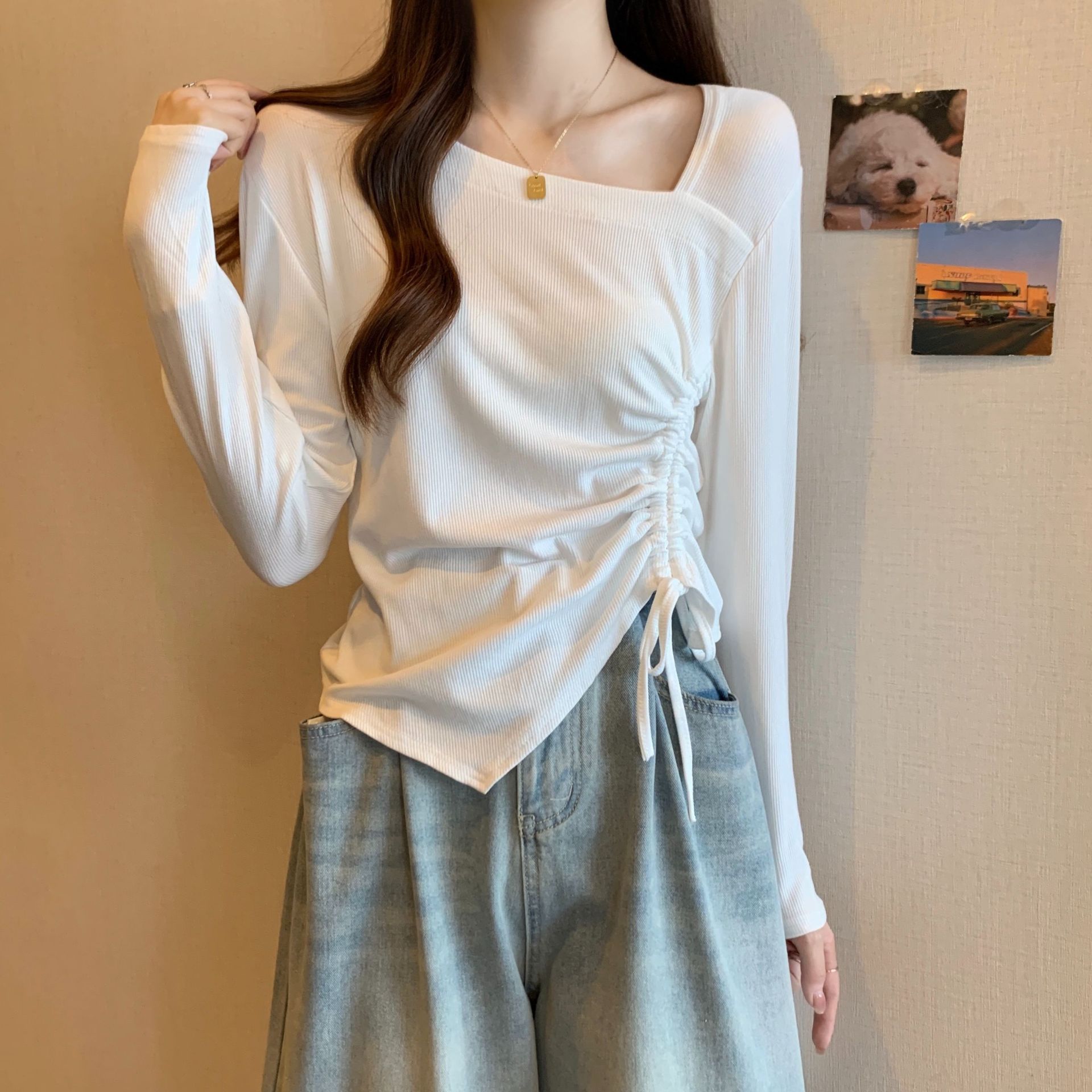 大码女装斜领长袖T恤秋季微胖妹妹不规则抽绳显瘦遮肉内搭上衣女