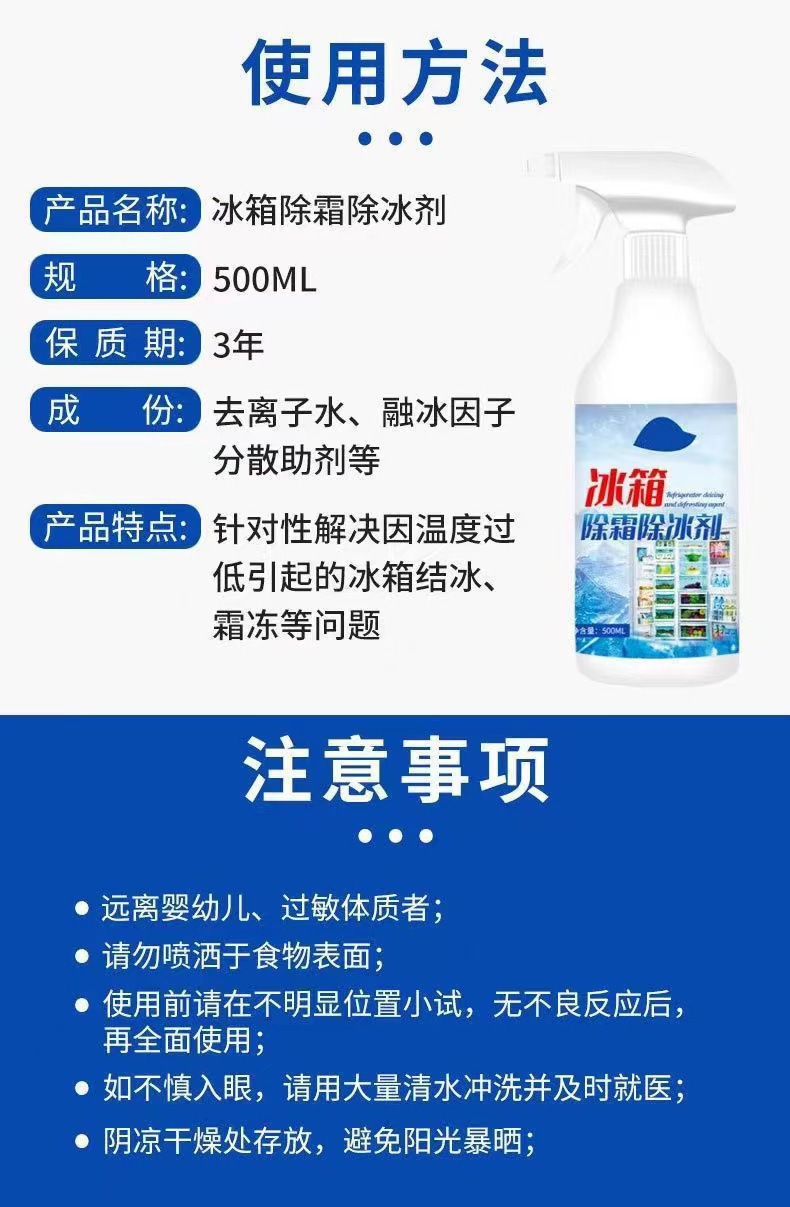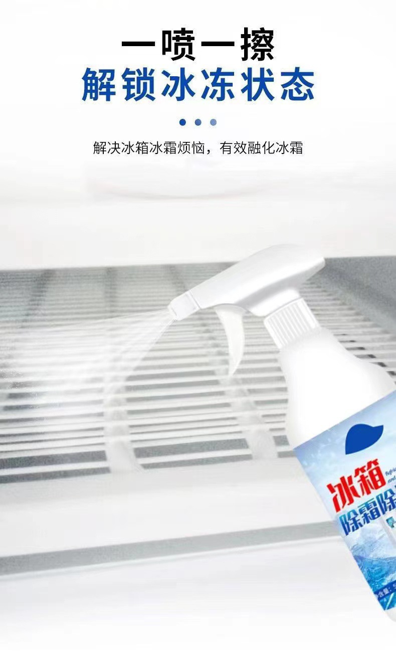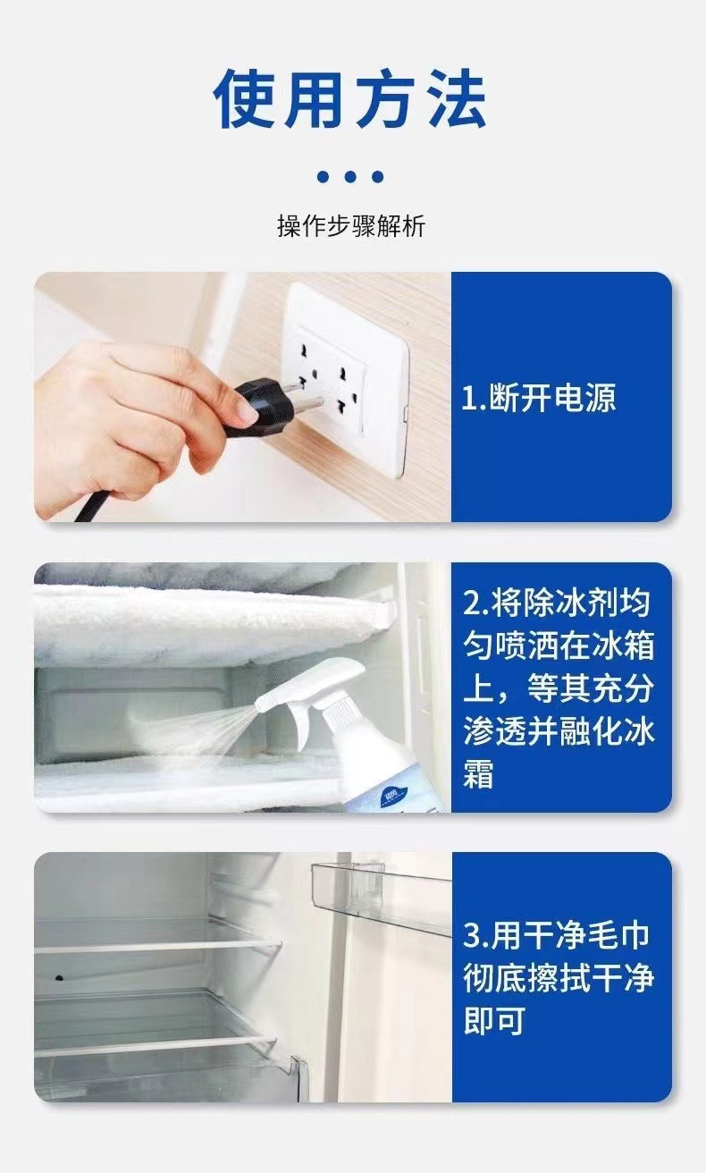 冷蔵庫の霜取り・除氷剤、氷の凍結防止、家庭用冷凍庫の氷の溶かし、氷の除去、冷蔵庫の除雪、氷の除去加工品