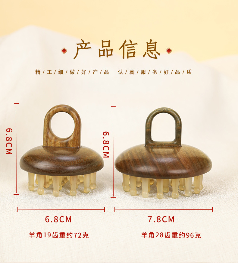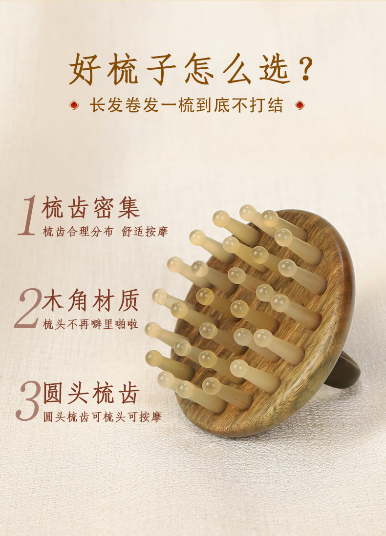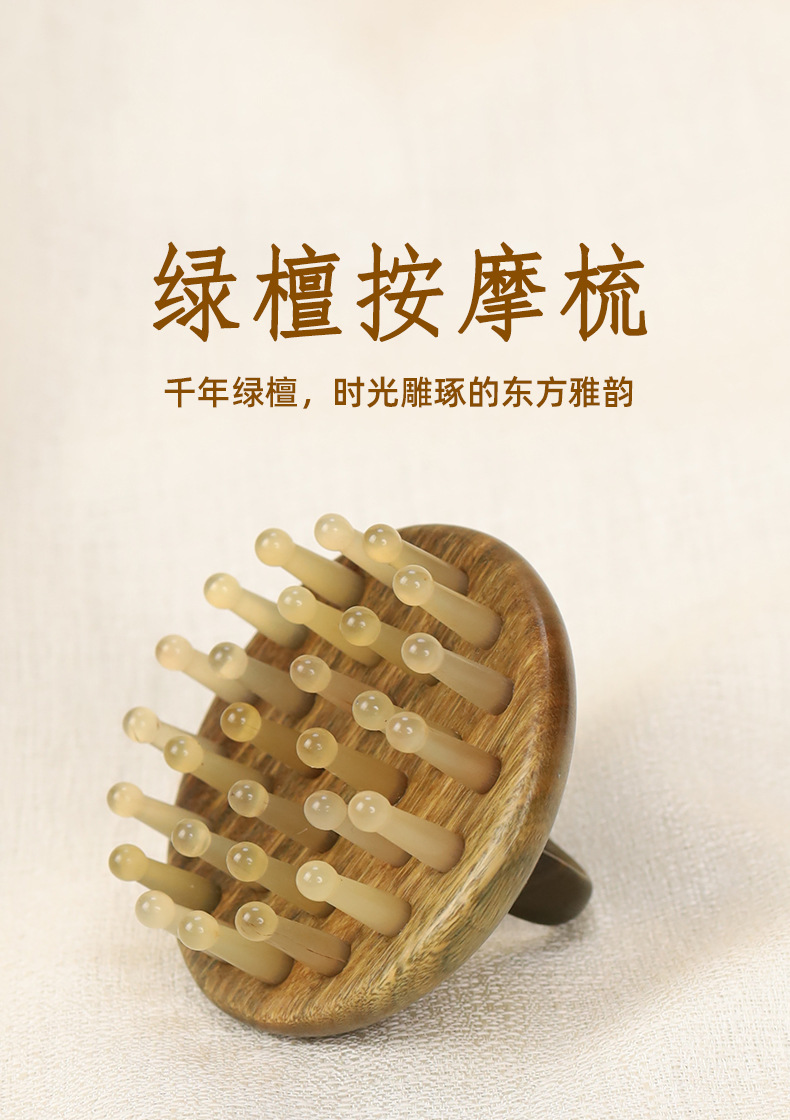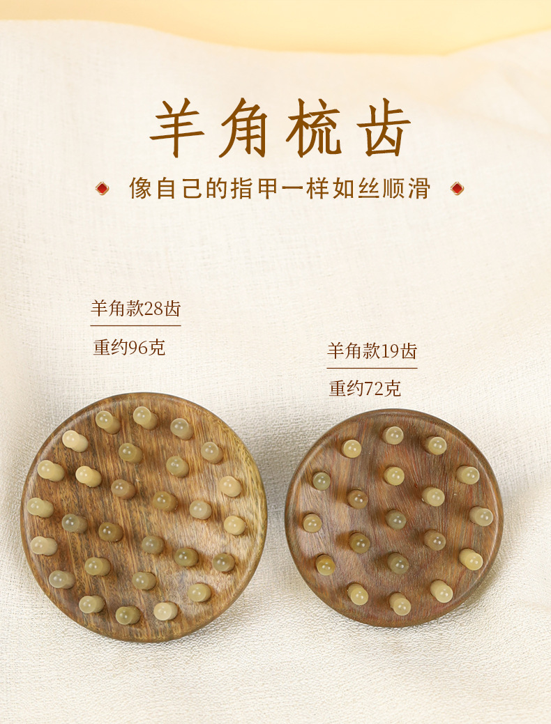 羊角按摩梳绿檀木头部经络28钉圆盘插齿梳指环梳按摩头皮养发