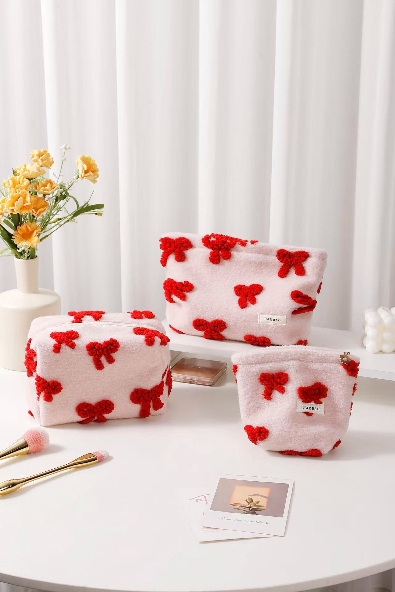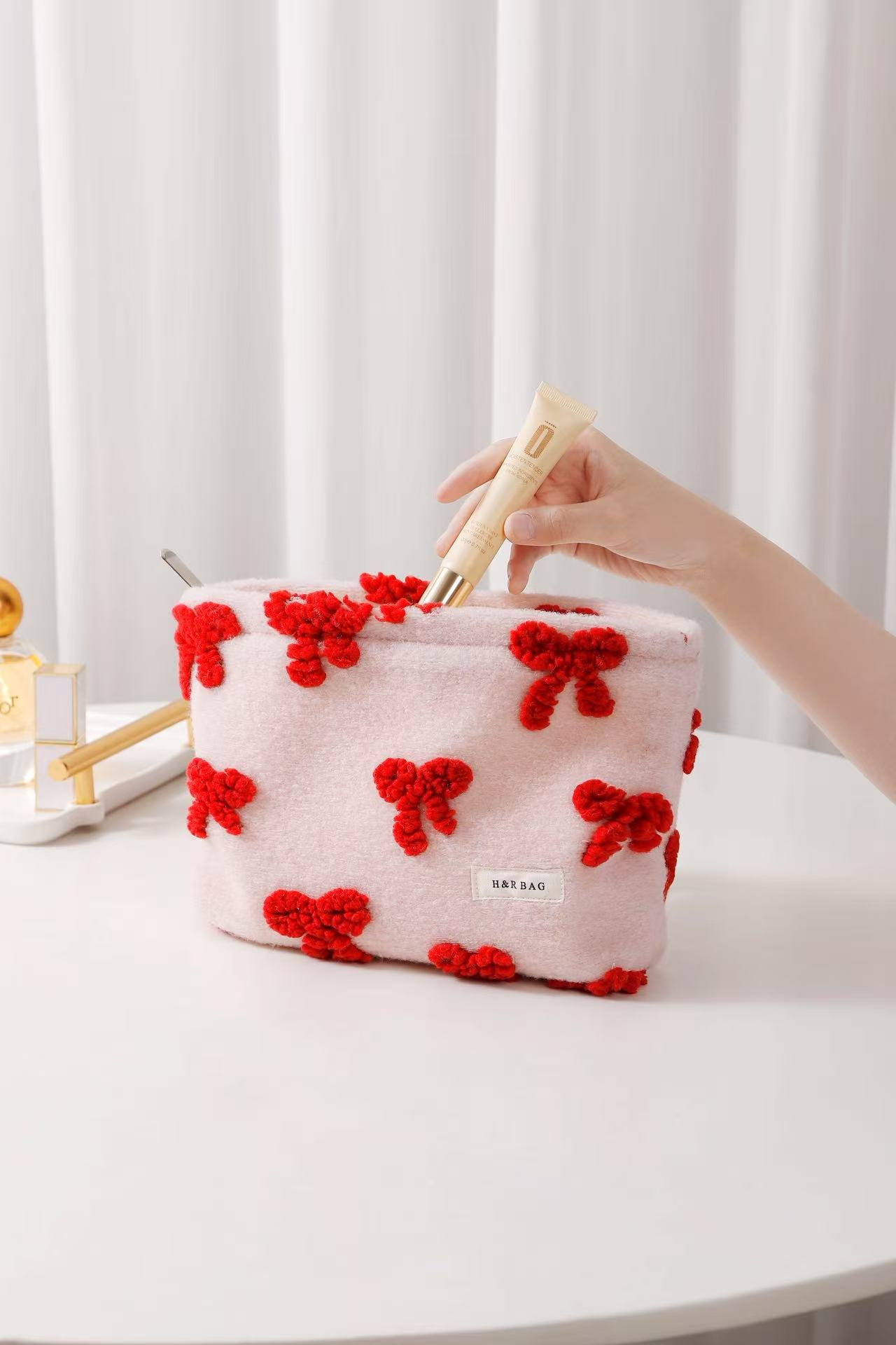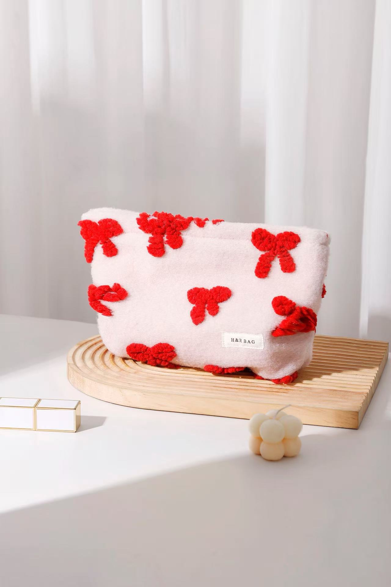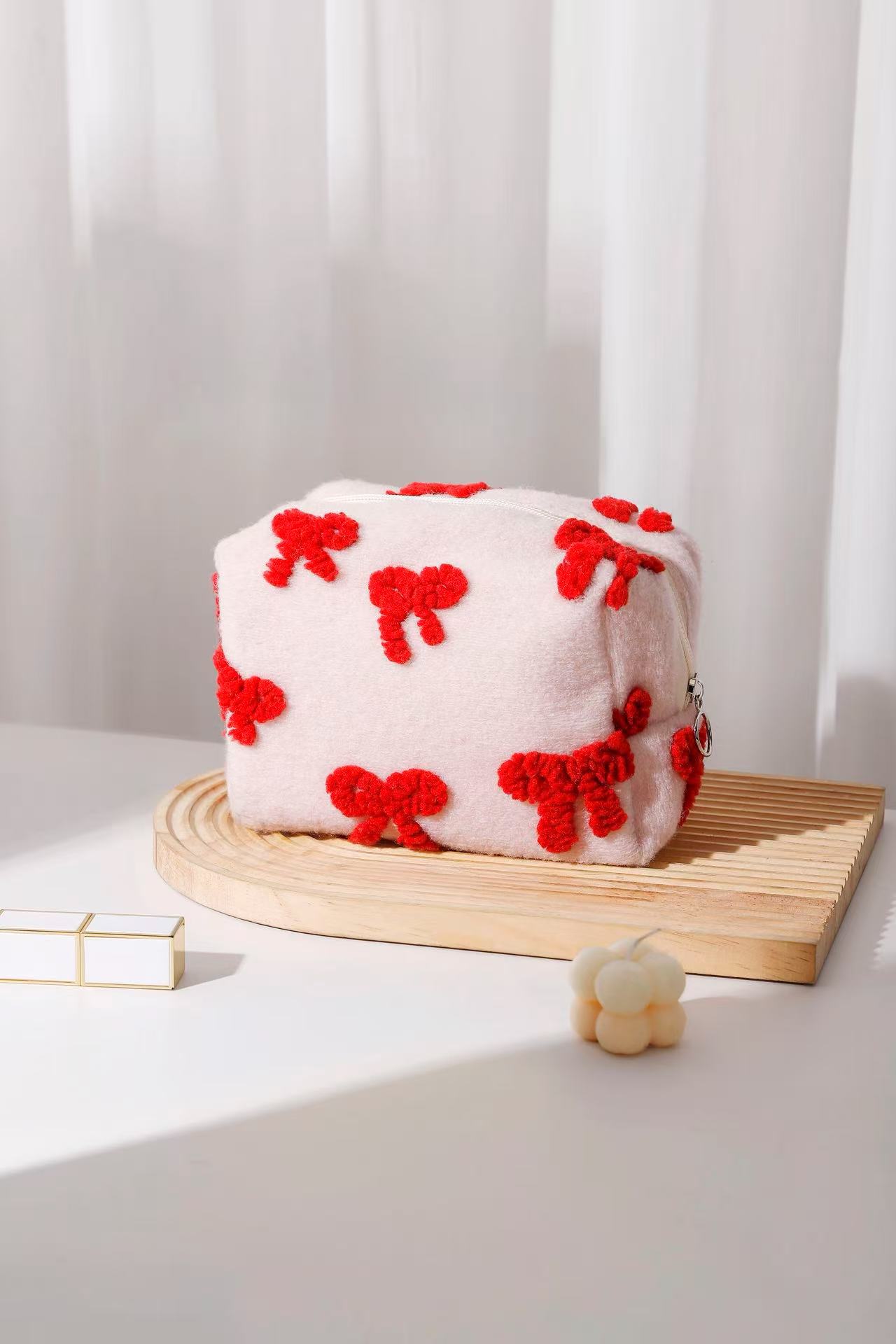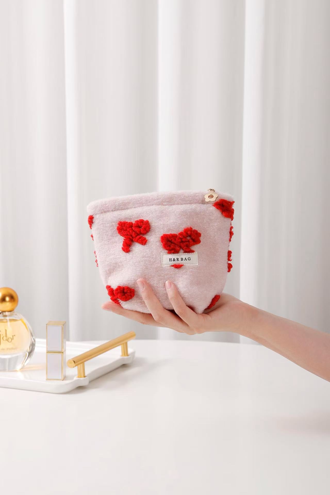 新しい甘いガーリーピンクぬいぐるみリボン化粧品バッグポータブルスキンケア製品収納袋クラッチバッグ