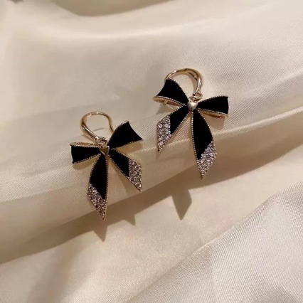黑色镶钻蝴蝶结耳环女简约时尚百搭小众轻奢高级感耳饰赫本风耳钩