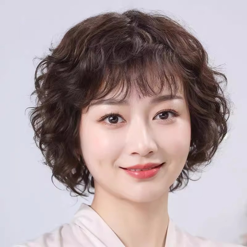 女性用ウィッグ、中高年向けフルウィッグ、自然な白髪カバー、短い巻き毛、ママ風、おしゃれな年齢軽減ウィッグ