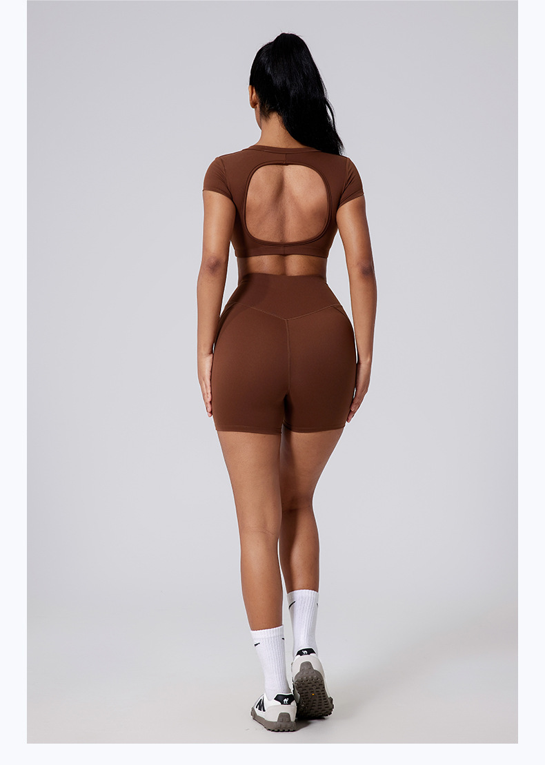 跨境裸感V领高腰裸感瑜伽套装短袖瑜伽服翘臀跑步运动健身服套装
