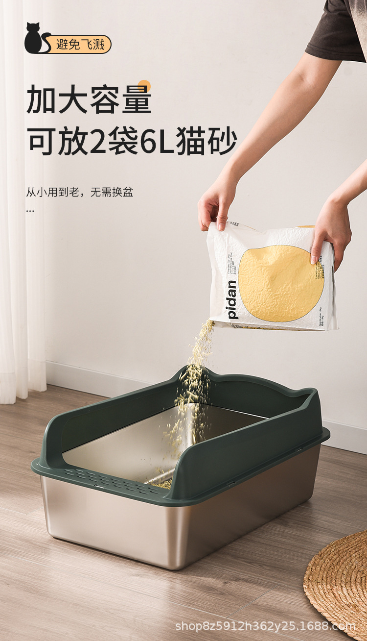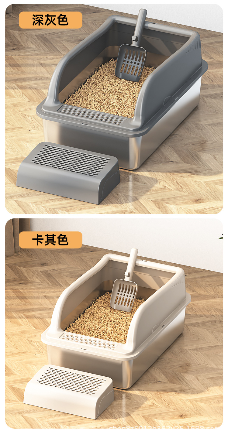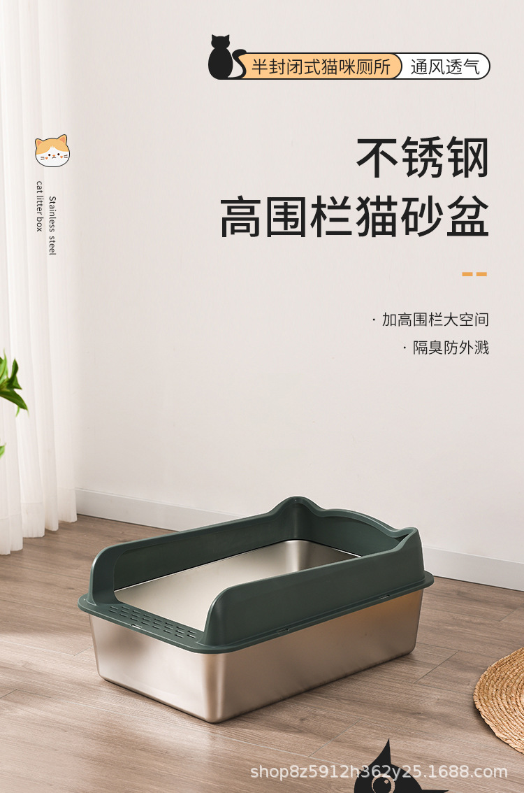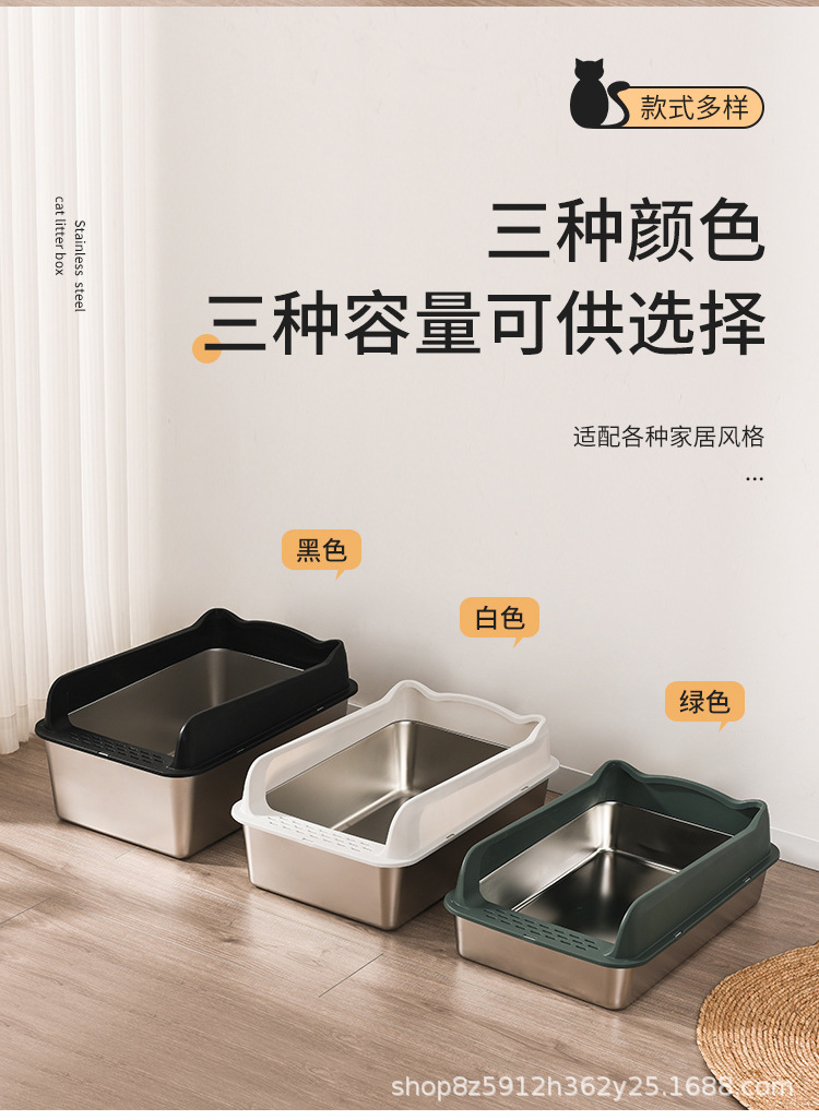 不锈钢猫砂盆亚马逊敞开式防外溅易清洗猫厕所厂家直销半封闭式