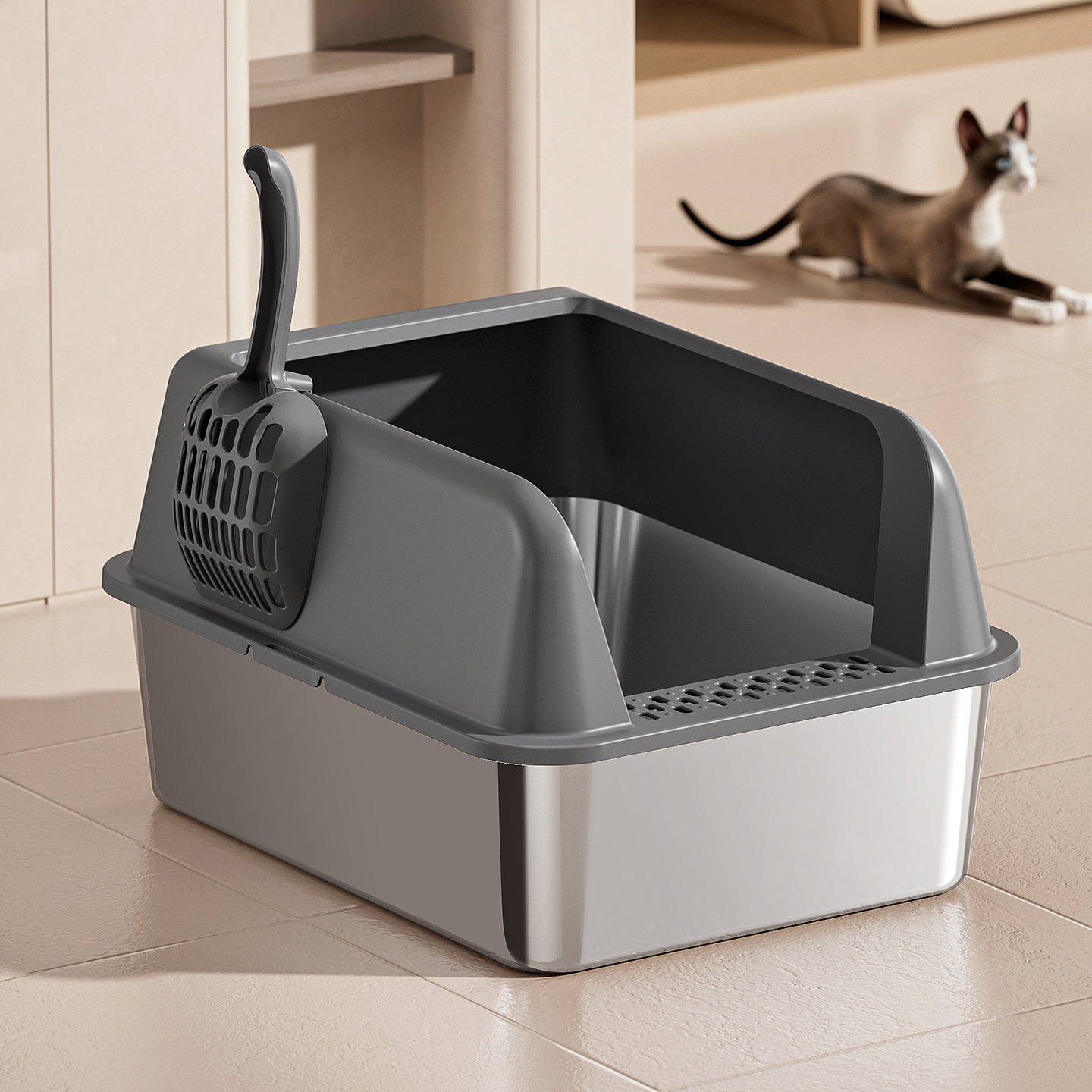 ステンレス製猫トイレ、持ち手付き大型猫専用、半密閉型飛沫防止、深めの長方形ペットトイレ