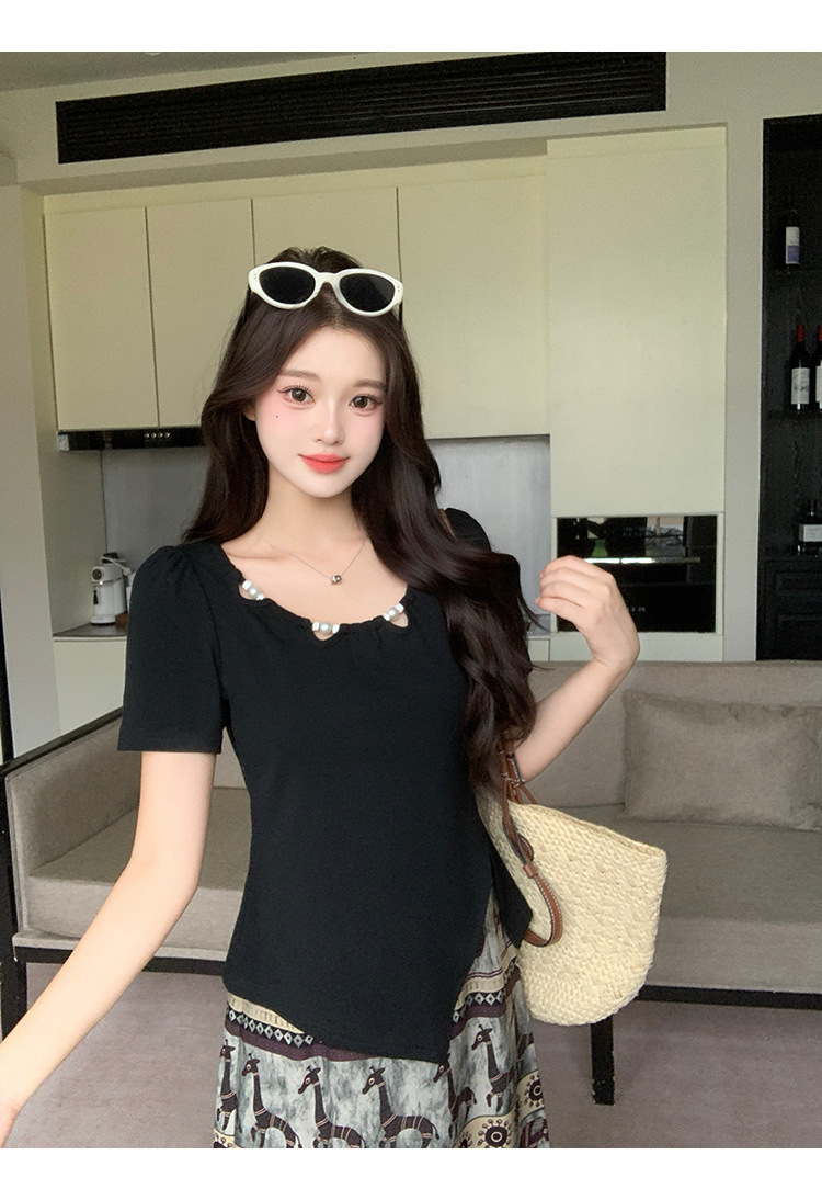 2025夏服の新型太ったmmの大きいサイズの女性のデザイン感は純色のアーチ形をねじって腰の半袖のtシャツを収めます。