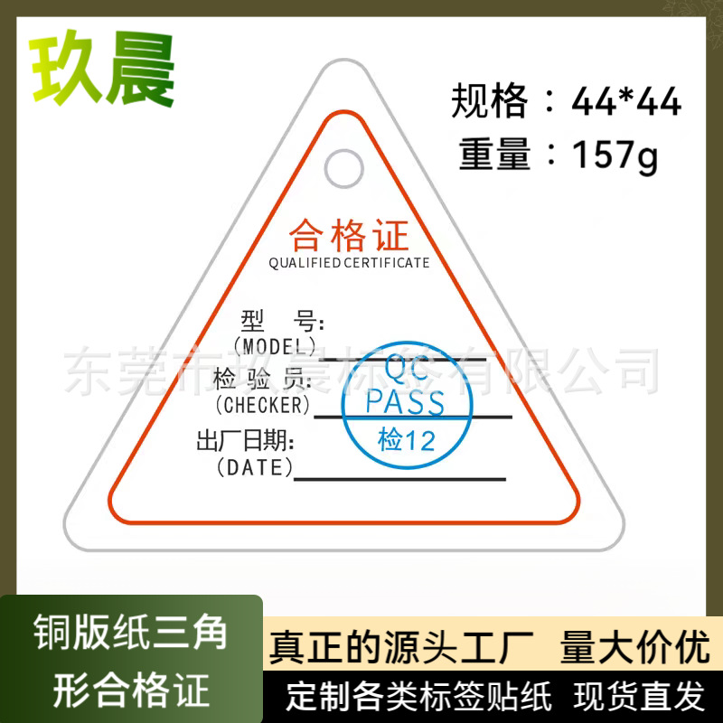 厂家供应157G 卡纸 中英文三角形合格证 吊牌通用出厂产品检验证