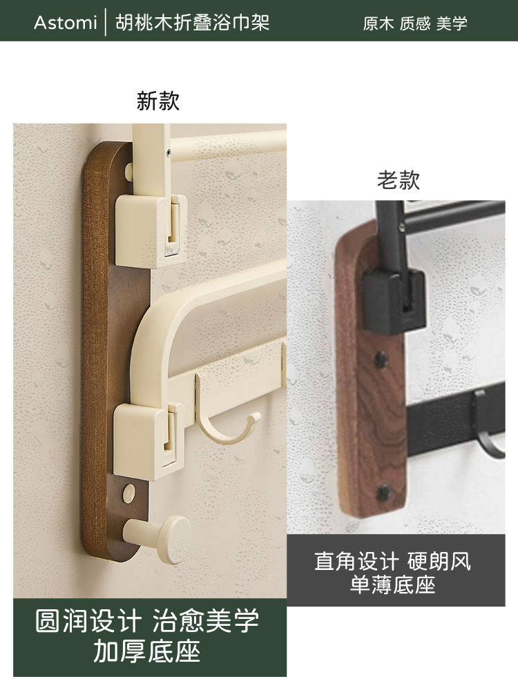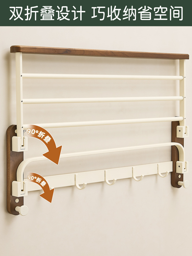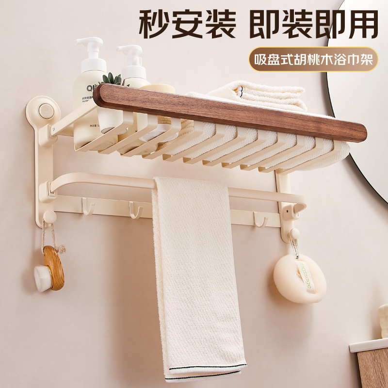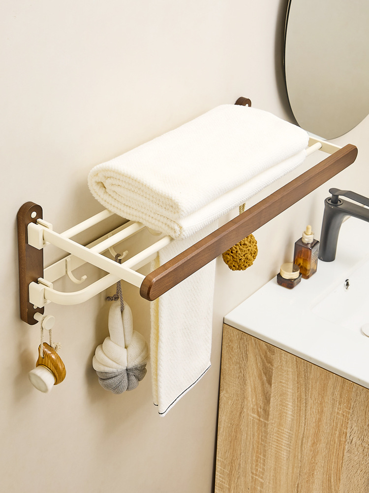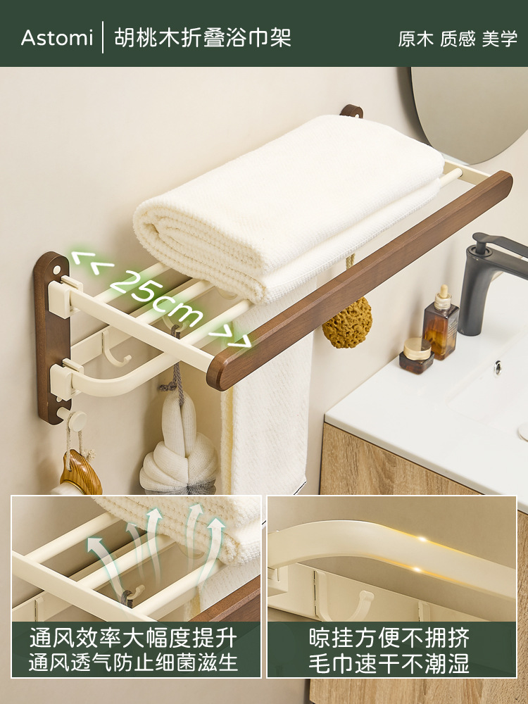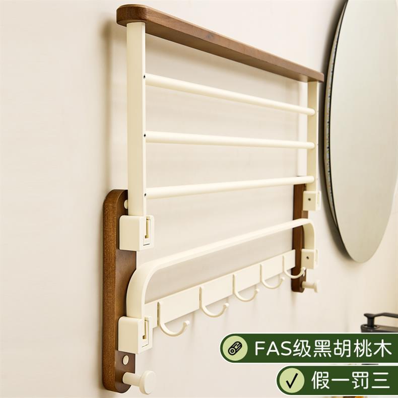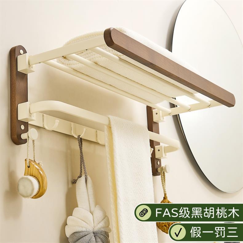 奶油风胡桃木毛巾架卫生间免打孔中古风浴室厕所浴巾置物架卫浴架