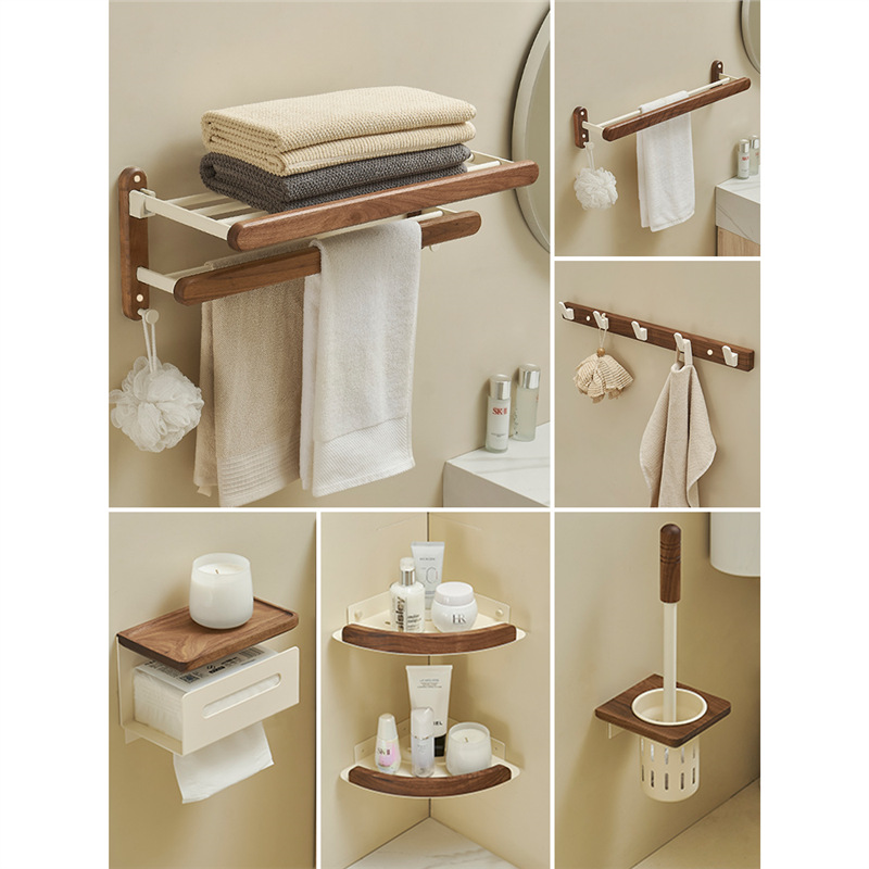 クルミ材バスルームタオルラック、穴あけ不要、中世風高級バスタオル収納ラック、バスルームシェルフ、トイレハンガー