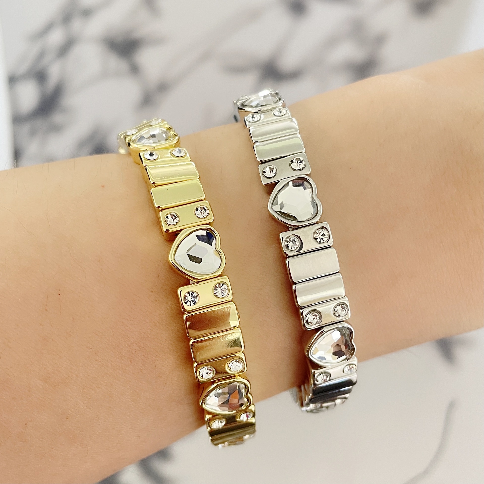 ヨーロッパとアメリカのクロスボーダーファッショナブルな厚いゴールドブロックラブパーソナライズされた弾性ビーズブレスレットライト高級ヨーロッパとアメリカンスタイルのハイエンドジュエリー
