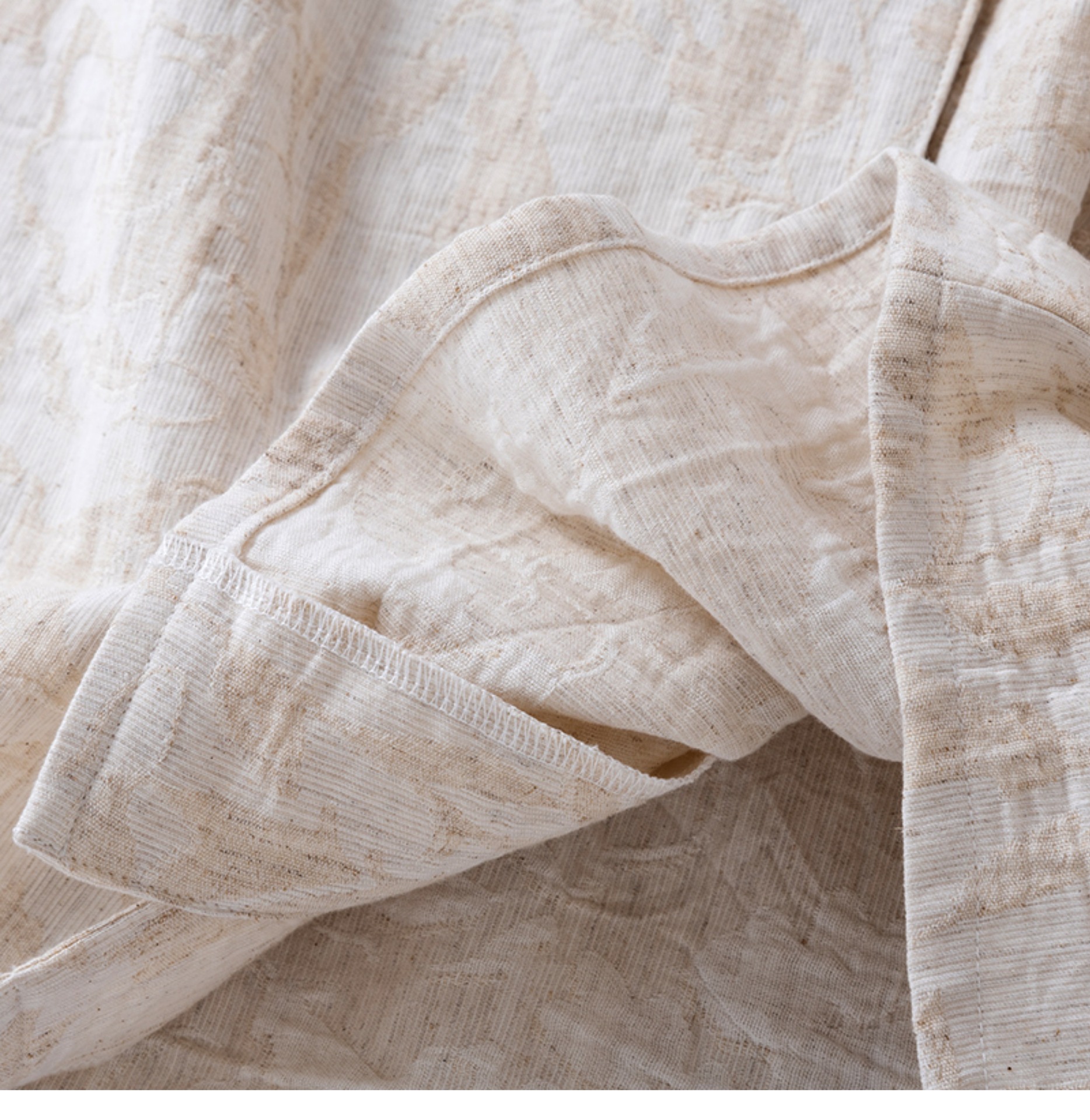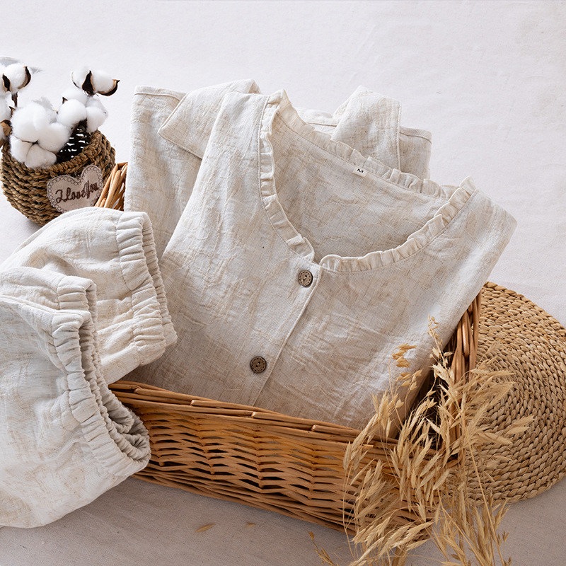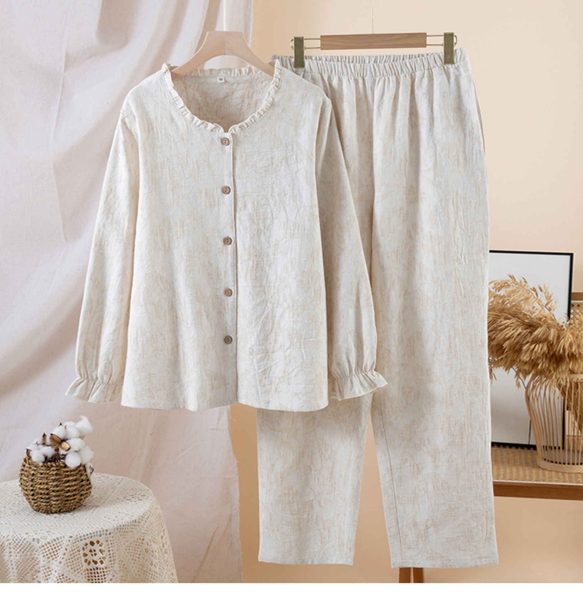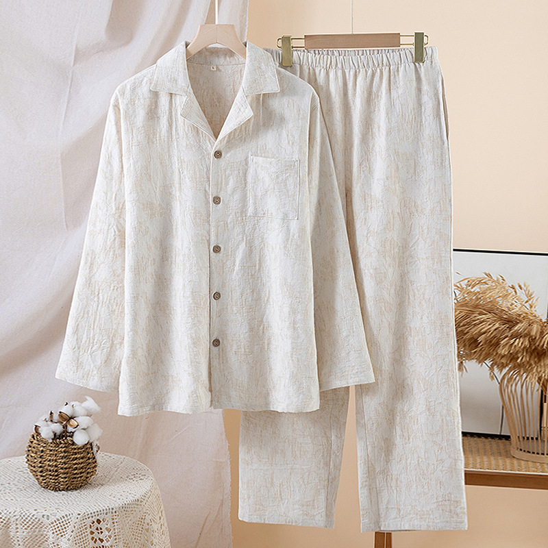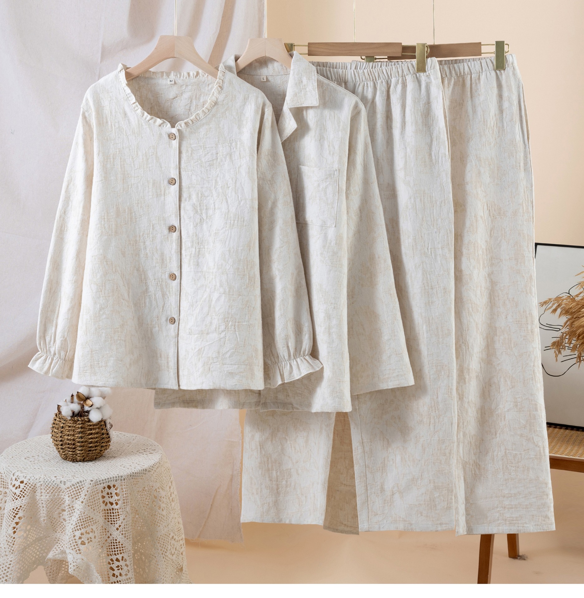 春と秋の新カップル綿とリネンパジャマ長袖カーディガンズボンスーツ日本製無印良品スタイル薄いホーム服男性と女性用